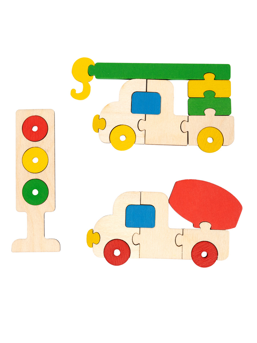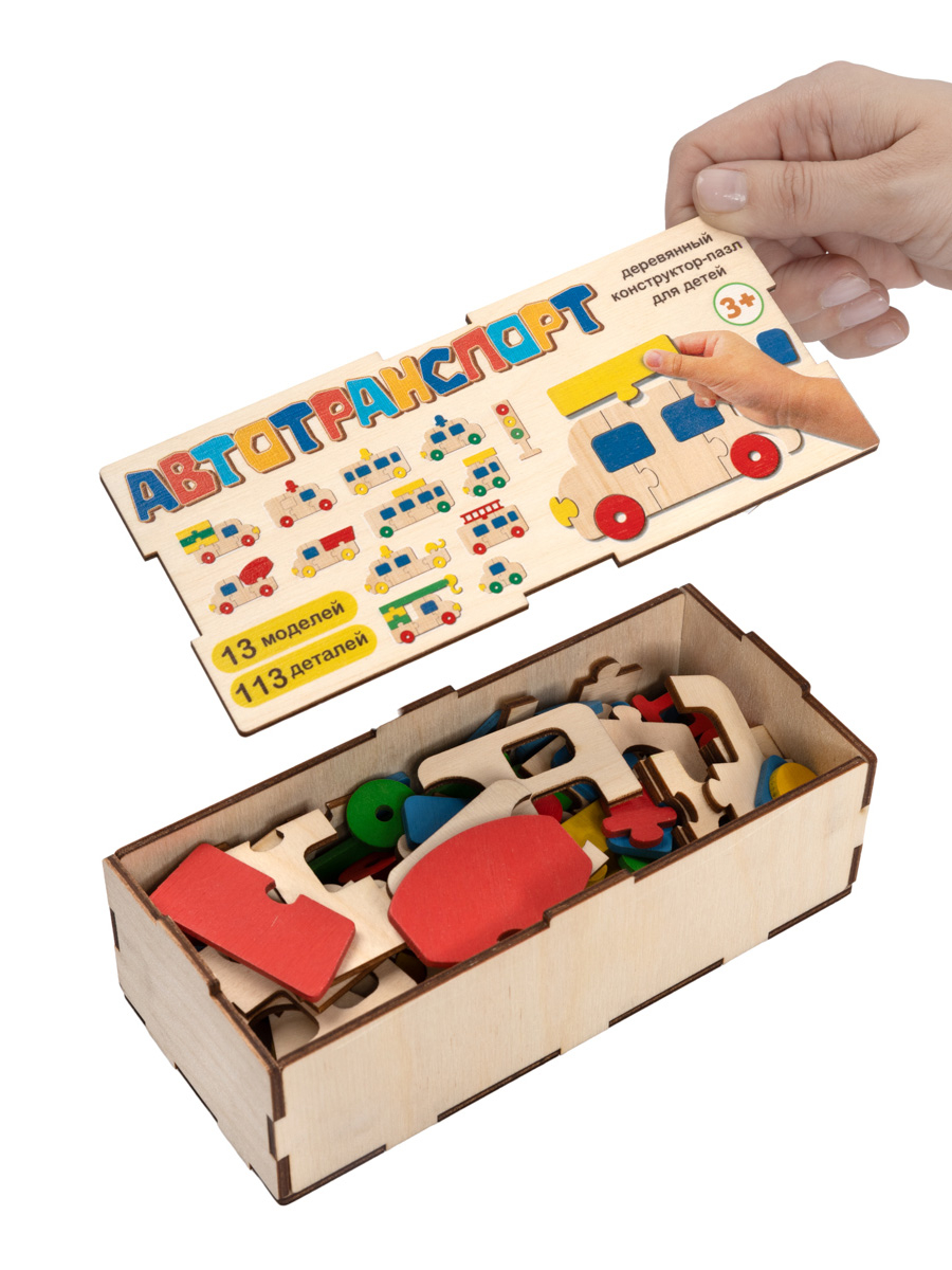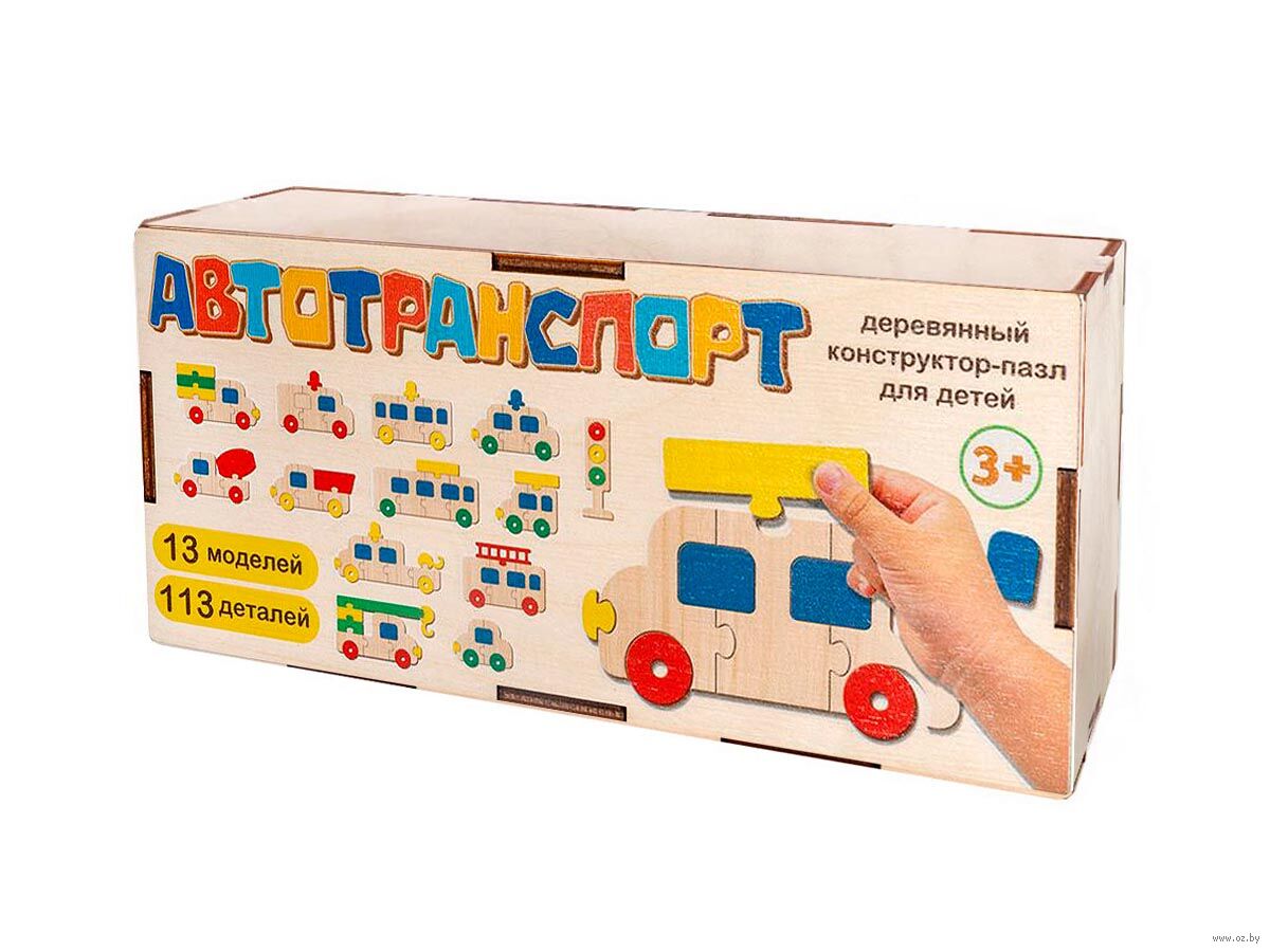 Деревянный конструктор-пазл "Автотранспорт"- это развивающая игра с элементами из древесного материала (экологичной березовой фанеры). С его помощью можно собрать 13 моделей. Края элементов закруглены и тщательно обработаны.