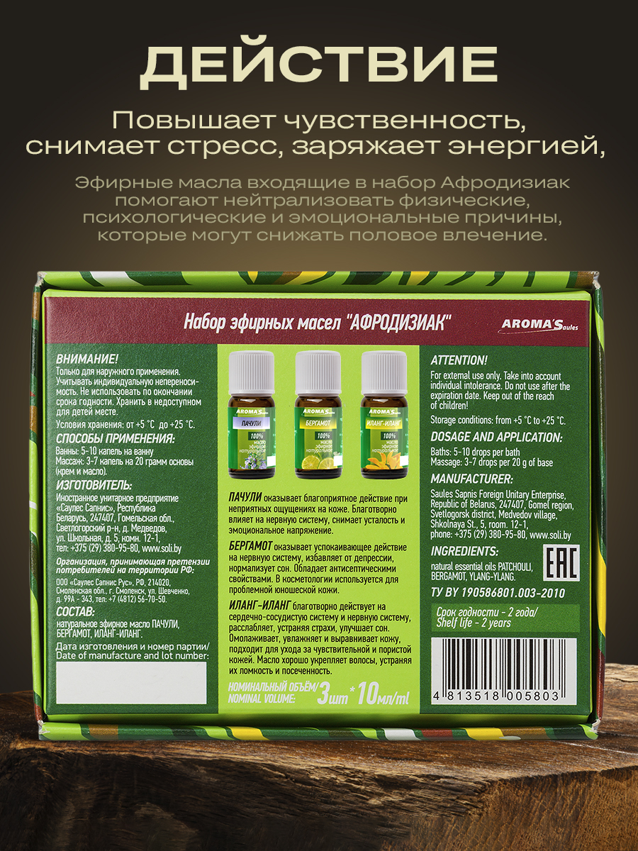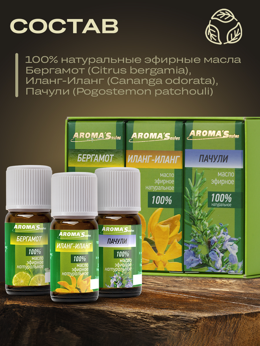 Натуральные эфирные масла пачули, иланг-иланга, бергамота, корицы, гвоздики.