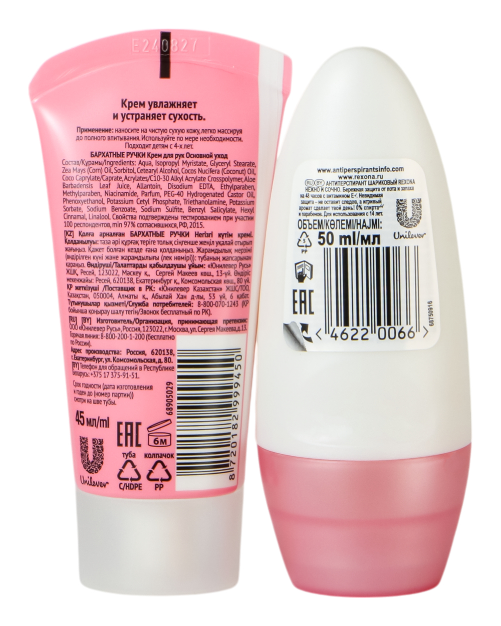 Антиперспирант: Aqua, Aluminum Chlorohydrate, Glycerin, Helianthus Annuus Seed Oil, Steareth-2, Parfum, Steareth-20, Disodium EDTA, Pentaerythrityl Tetra-di-t-butyl Hydroxyhydrocinnamate, Potassium Lactate, Citric Acid, Alpha-Isomethyl Ionone, Benzyl Alcohol, Benzyl Salicylate, Butylphenyl Methylpropional, Citronellol, Hexyl Cinnamal, Hydroxycitronellal, Limonene, Linalool.