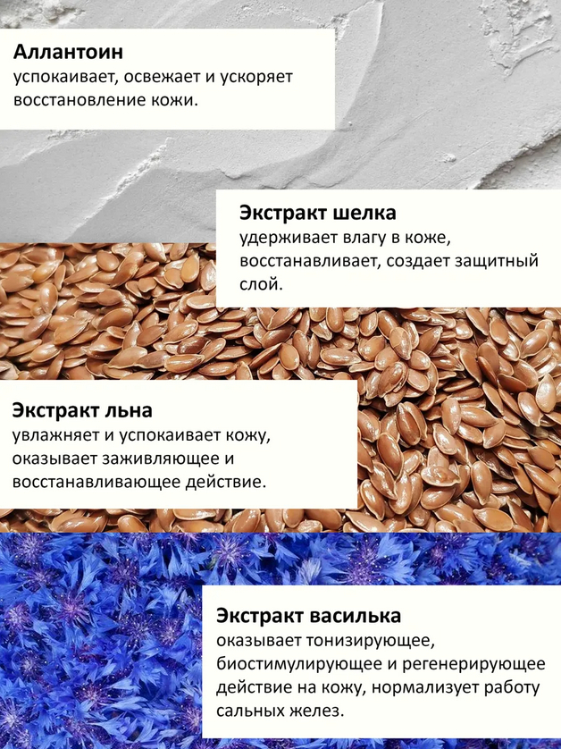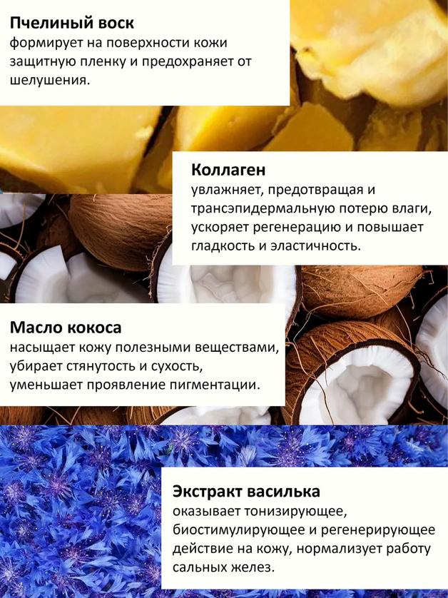 Крем для рук: Aqua, Glyceryl Stearate SE, Dibutyl Adipate, Cocos Nucifera Oil, Glycerin, Isopropyl Palmitate, Cera Alba, Stearic Acid, Centaurea Cyanus Flower Water, Collagen, Betaine, Centaurea Cyanus Flower Extract, Sodium Hyaluronate, Phenoxyethanol, Glucose, Allantoin, Parfum, Xanthan Gum, Disodium Cetearyl Sulfosuccinate, Clitoria Ternatea Flower Powder, Ethylhexylglycerin, Hexyl Cinnamal, Linalool, Limonene, Citronellol, Benzyl alcohol.