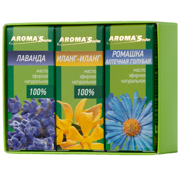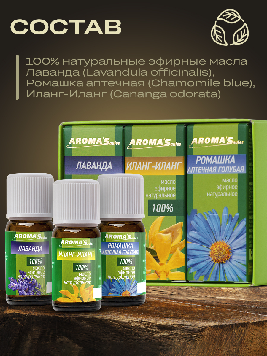 Натуральные эфирные масла лаванды, иланг-иланга, ромашки аптечной голубой (+ масло зародышей пшеницы)