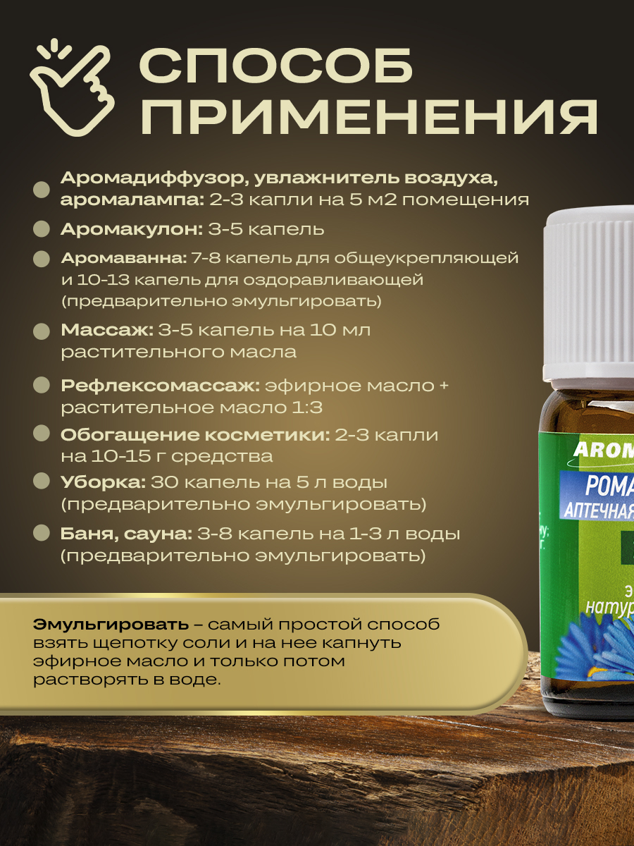 Аромалампа. Проветрить комнату, закрыть окна. Налить в аромалампу теплой воды, капнуть туда эфирного масла (2 капли на 5 м 2 площади помещения). Зажечь свечу под аромалампой. Вода не должна кипеть. Время работы лампы: от 20 минут до 2-х часов. Не оставлять горящую лампу без присмотра. Подливать воду по мере необходимости.Состав