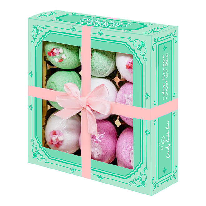Продукт выполнен в подарочном оформлении с бантом и создан быть подарком. Чтобы подарить радость не нужен повод, нужен лишь набор бурлящий шаров Candy bath bar!
