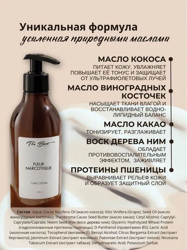 Гель для душа: аqua, Сocamidopropyl Betaine, Decyl Glucoside, Sodium Cocoyl Isethionate, Sodium Cocoyl Glutamate, Glycerin, Lactic Acid (молочная кислота), Benzyl Alcohol, D-panthenol (провитамин В5), Gel Aloe Vera (гель алоэ вера), Citrus Bergamia Extract (экстракт бергамота), Jasminum Extract (экстракт жасмина), Paeonia Extract (экстракт пиона), Sodium Benzoate, Dehydroacetic Acid, Parfum.