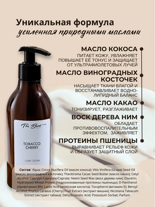 Гель для душа: аqua, Сocamidopropyl Betaine, Decyl Glucoside, Sodium Cocoyl Isethionate, Sodium Cocoyl Glutamate, Glycerin, Lactic Acid (молочная кислота), Benzyl Alcohol, D-panthenol (провитамин В5), Gel Aloe Vera (гель алоэ вера), Prunus Cerasus (Cherry) Fruit Extract (экстракт вишни), Nicotiana Tabacum Extract (экстракт табака), Sodium Benzoate, Dehydroacetic Acid, Parfum.