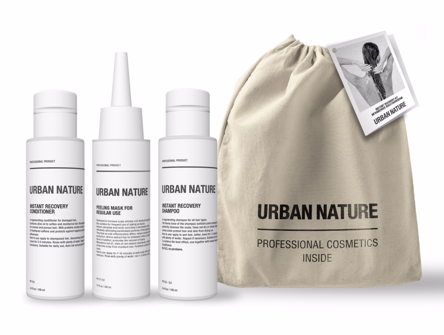 Восстанавливающий шампунь (100 мл) не только очищает, но и доносит питательные вещества. Деликатный пилинг (100 мл) глубоко очищает кожу головы и устья фолликул, подготавливает дерму к эффективному усвоению активных веществ. Кондиционер для волос (100 мл) питает, уплотняет запечатывает чешуйки.