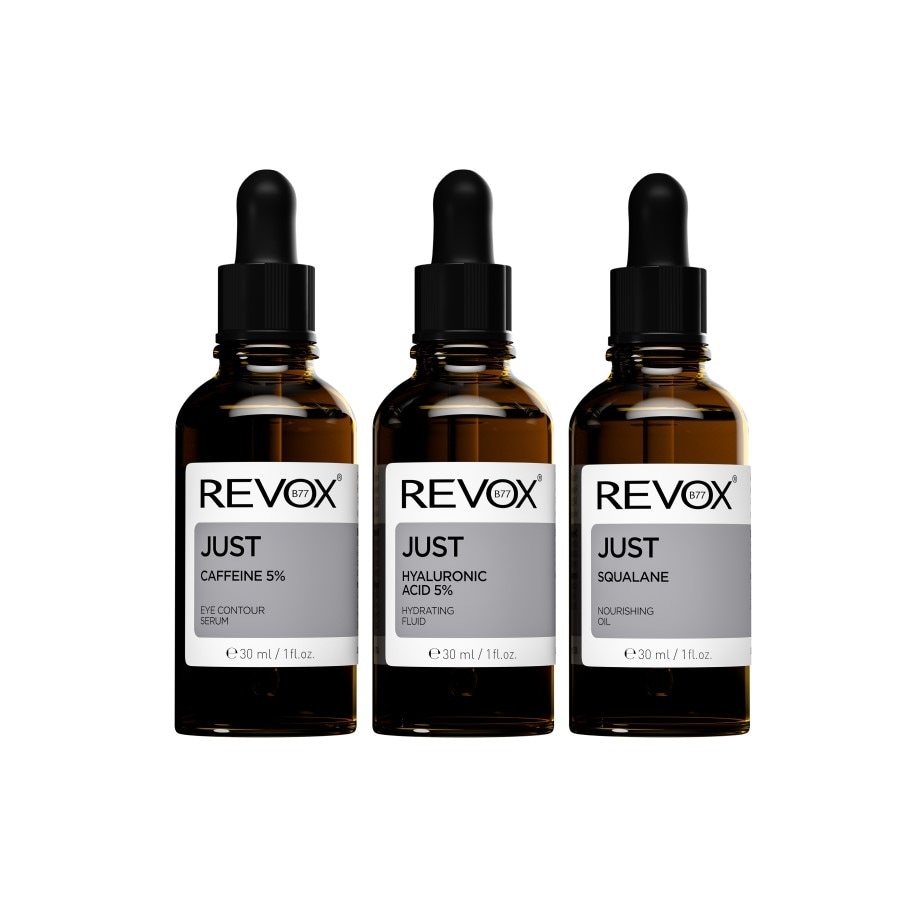 Шаг 1: Утренняя энергия. Утром, после бережного очищения кожи промокните кожу полотенце и нанесите на область вокруг глаз энергетическое средство REVOX B77 JUST с кофеином 5%. Кончиками пальцев слегка похлопайте по коже вокруг глаз, чтобы нанести несколько капель сыворотки, и дайте ей впитаться. Результат: мгновенное ощущение подтянутости и видимое тонизирование кожи. Всего через несколько минут вы будете выглядеть более бодрой и свежей, а кожа под глазами с каждым днём будет выглядеть всё лучше.Состав