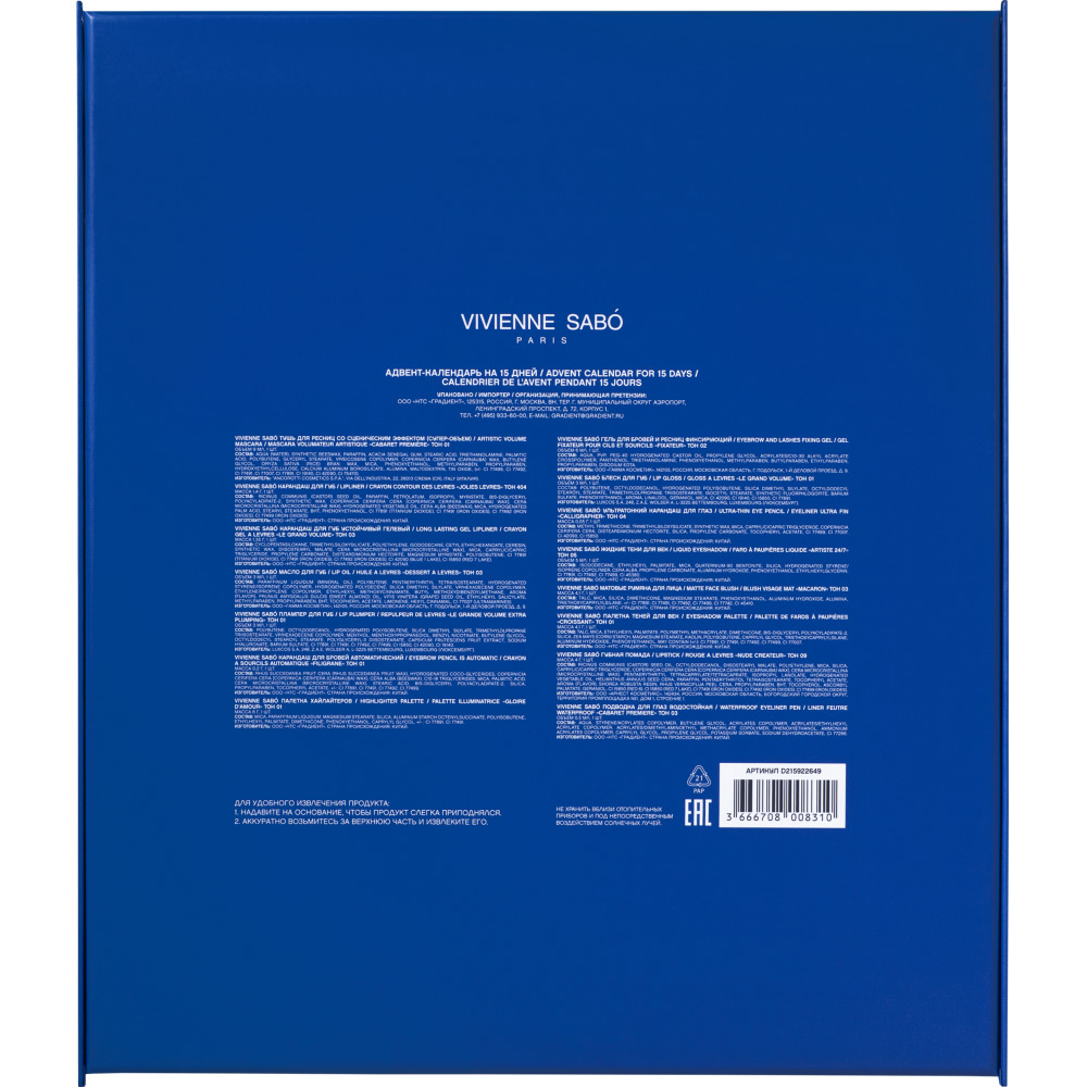 Адвент-календарь от Vivienne Sabo – лимитированный набор косметики в подарочной упаковке. Открывай ячейки по порядку в течение декабря, чтобы порадовать себя бьюти-сюрпризами и ощутить предчувствие праздника.