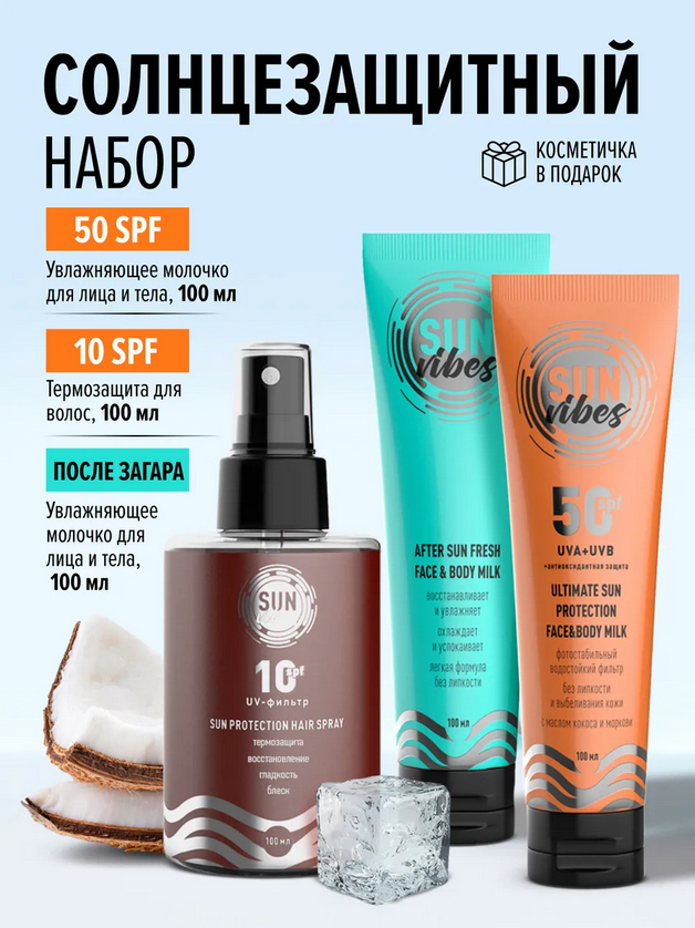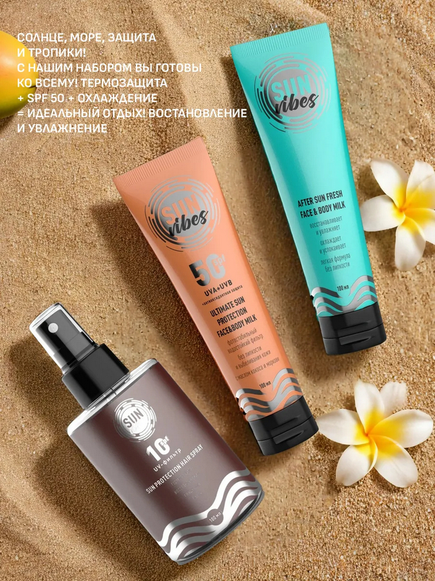 1. Увлажняющее молочко для лица и тела 50 SPF SUN VIBES, 100 мл - Aqua, Ethylhexyl Methoxycinnamate, Mineral Oil, Stearic Acid, Cetearyl Alcohol, Bis-Ethylhexyloxyphenol Methoxyphenyl Triazine, Diethylamino Hydroxybenzoyl Hexyl Benzoate, Glycerin, Phenoxyethanol, Ethylhexylglycerin, Zinc Oxide, Butyr-ospermum Parkii Butter, Cocos Nucifera (Coconut), Hydroxyethyl Acrylate, Sodium Acryloyldimethy Taurate Copolymer, Isohexadecane, Polysorbate-60,Panthenol, Parfum, Xanthan Gum, Daucus Carota Sativa Seed Oil, Propylene Glycol, Cereus Grandifforus Extract, Cocos Nucifer (Coconut) Fruit Extract, Man-gifera Indica (Mango) Extact, Evening Primrose Oil, Extract Daucus Carota, Butylhydroxytoluene, Limonene, Linalool. 2.Спрей-уход для волос защитный восстанавливающий SPF 10, 100 мл - Aqua, Ethylhexyl Methoxycinnamate, (etearyl Alcohol, Dipalmitoylethyl Hydroxyethylmonium Methosulfate, Ceteareth-20, Cyclopentasiloxane, Bis-Cetearyl Amodimethicone (And) Ceteareth-7 (And) Ceteareth-25, Water (And) Silicone Quaternium-18 (