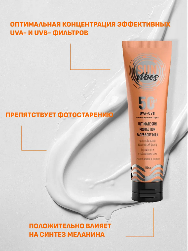 1. Увлажняющее молочко для лица и тела 50 SPF SUN VIBES, 100 мл – Увлажняющее молочко для лица и тела обеспечит надежную защиту от агрессивного ультрафиолетового излучения для кожи любого типа. Для формулы средства подобрана оптимальная концентрация эффективных UVa- и UVß- фильтров. Одни поглощают ультрафиолетовые лучи, нейтрализуя их повреждающее действие на кожу. Другие работают как своего рода экран, который отражает ультрафиолет, препятствуя фотостарению и снижая риск солнечных ожогов.