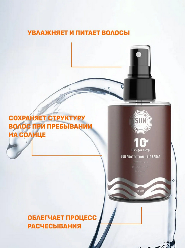 2.Спрей-уход для волос защитный восстанавливающий SPF 10, 100 мл – Спрей-уход предназначен для ухода за волосами в период пребывания на солнце как в отпуске, так и в период активного солнца в городе. Благодаря входящим в его состав компонентам спрей защищает волосы и кожу головы от вредного воздействия УФ-лучей, предотвращая потерю влаги и цвета волос. Обладает термозащитными свойствами.