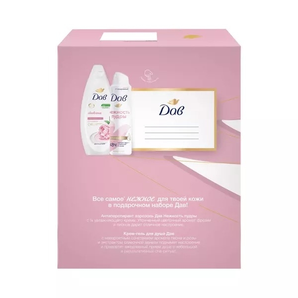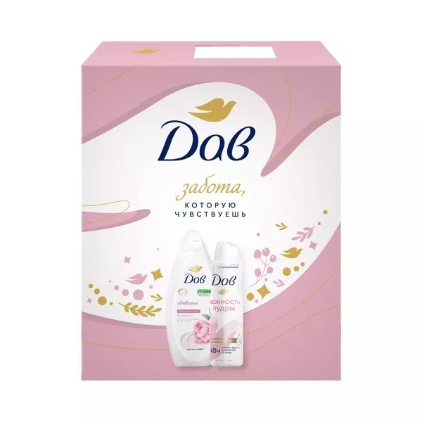 Подарочный набор для женщин "Обновление" включает в себя крем-гель для душа увлажняющий (250 мл) и дезодорант-антиперспирант спрей (150 мл).