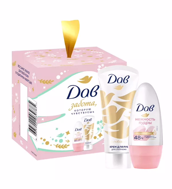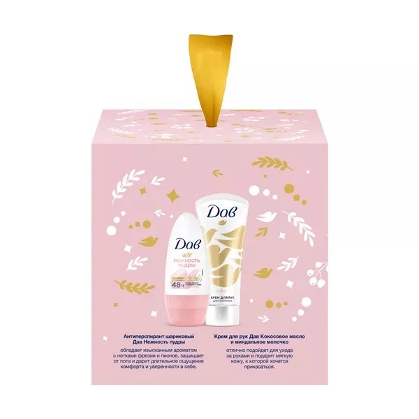 В комплект входят два эффективных продукта: крем для рук (45 мл) и дезодорант шариковый (50 мл). Крем для рук увлажняющий и питательный обогащен кокосовым маслом и миндальным молочком. Кроме того, формула средства содержит DeepCare Complex – комплекс ухода от Дав с компонентами, близкими к структуре кожи, для более эффективного ее питания и увлажнения. Шариковый дезодорант эффективно защищает от пота и неприятного запаха в течение 48 часов.