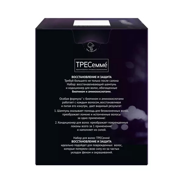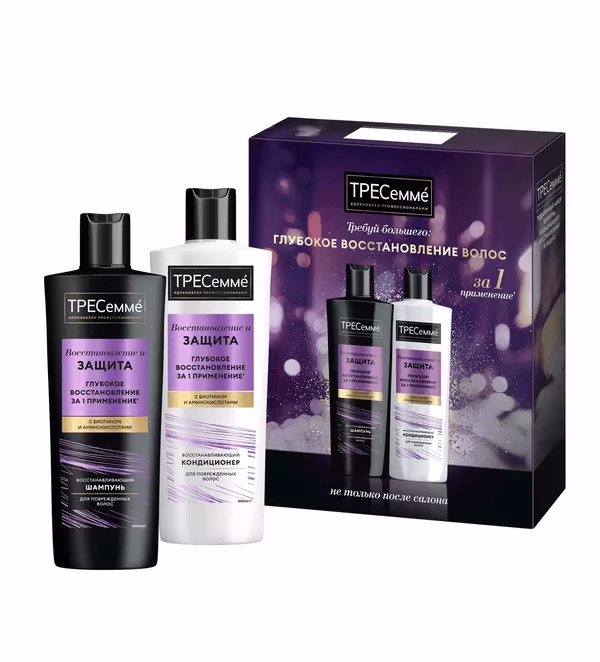 В состав набора входят восстанавливающий шампунь (230 мл) и кондиционер для волос (230 мл). Особая формула средств обогащена биотином и аминокислотами. Формула с этими компонентами обеспечивает восстановление и питание волос за 1 применение. Средства идеально подходят для ежедневного ухода за поврежденными, окрашенными, осветленными и мелированными волосами.