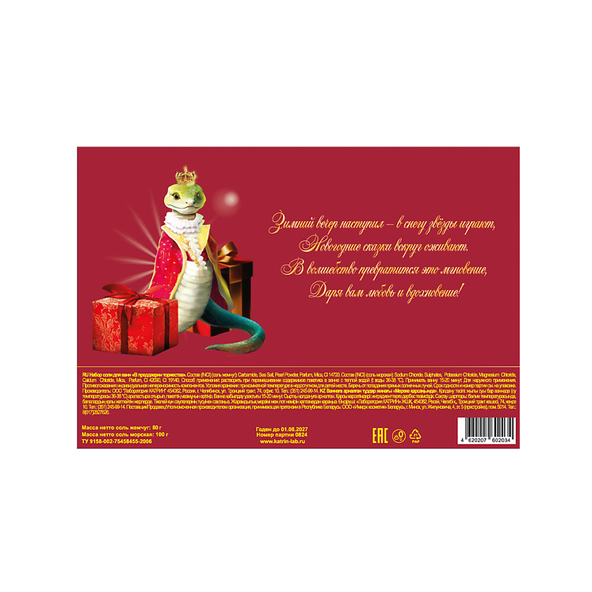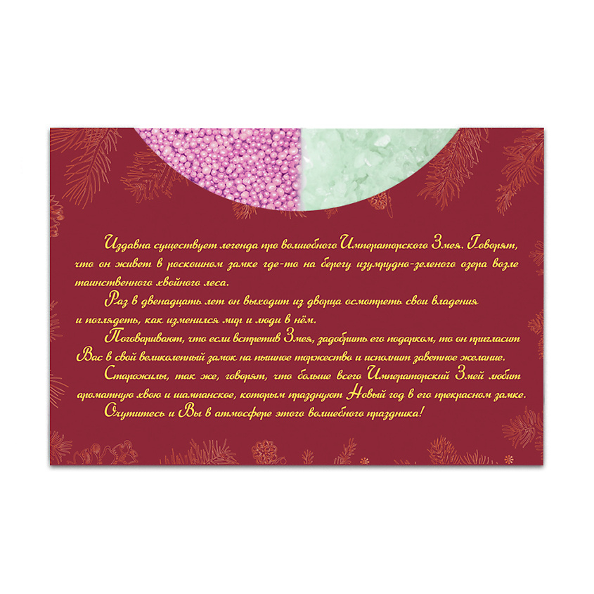 Набор-открытка "В предверии торжества " с символом года 2025 состоит из пакетика перламутровой изумрудной соли с ароматом свежей хвои и пакетика жемчужной розовой соли с ароматом игристого шампанского.