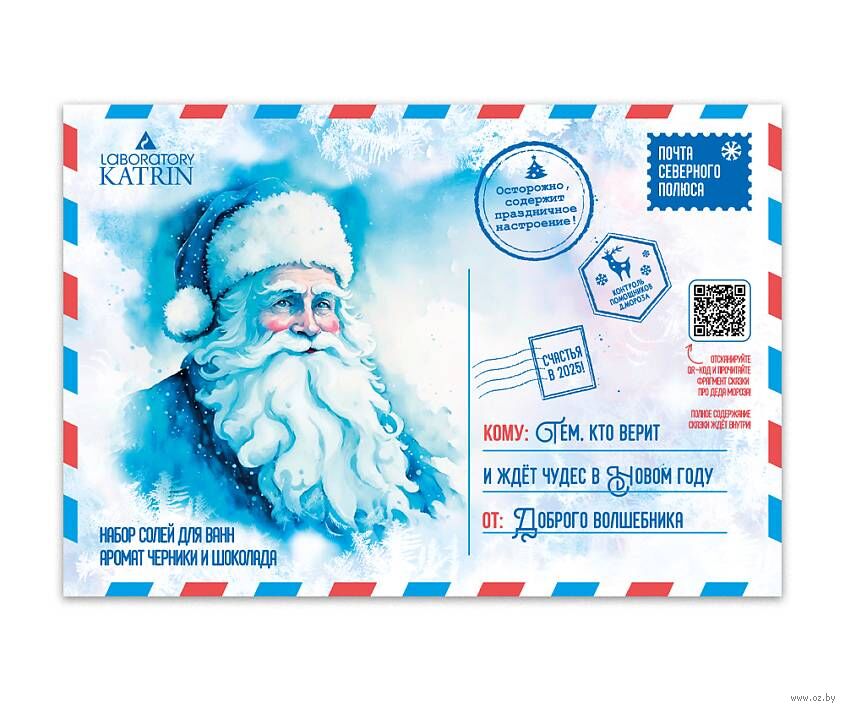 Набор соли для ванны – открытка "Почта северного полюса " состоит из пакетика фиолетовой перламутровой соли с ароматом черники и пакетика жемчужной соли с ароматом горячего шоколада.