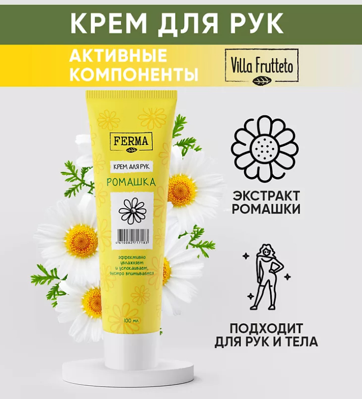 Предназначен для интенсивного увлажнения кожи рук и тела. Экстракт ромашки эффективно успокаивает и тонизирует кожу. Лёгкая текстура крема быстро впитывается и не оставляет жирного блеска. Сладковатый цветочный аромат ромашки дарит лёгкий шлейф, оставляя ощущение мягкости и свежести. Регулярное применение крема сохранит красоту и нежность вашей кожи.