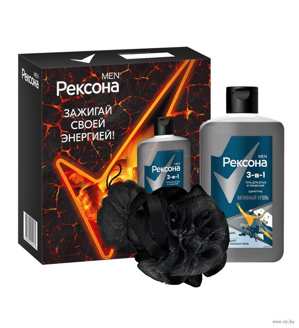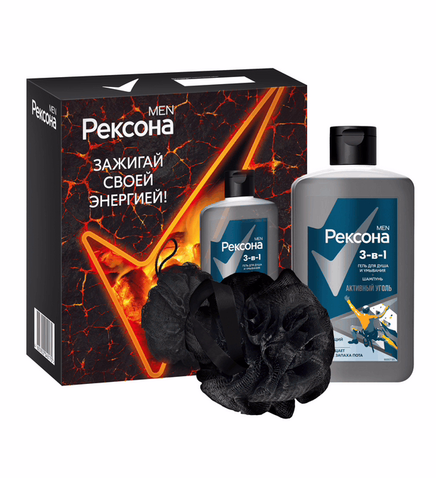 Подарочный набор мужчине "Активный уголь" включает в себя гель для душа, средство для умывания лица и шампунь для волос 3в1 (490 мл), а также стильную черную мочалку для душа.