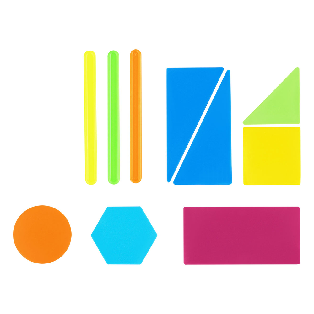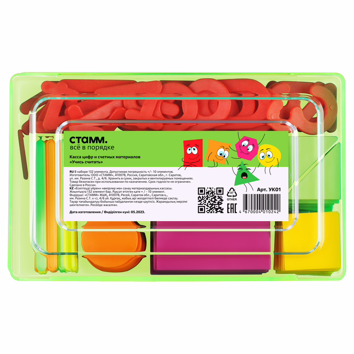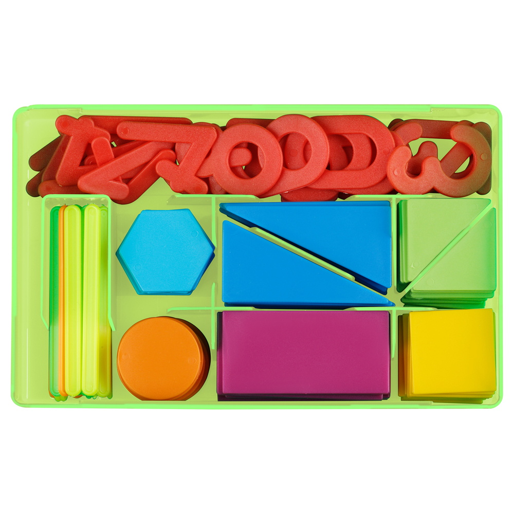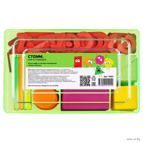 В состав кассы входят: прямоугольник, квадрат, прямоугольный треугольник, равнобедренный треугольник, круг, пятиугольник, цифры от 0 до 9 – 2 комплекта, математические знаки, счетные палочки.