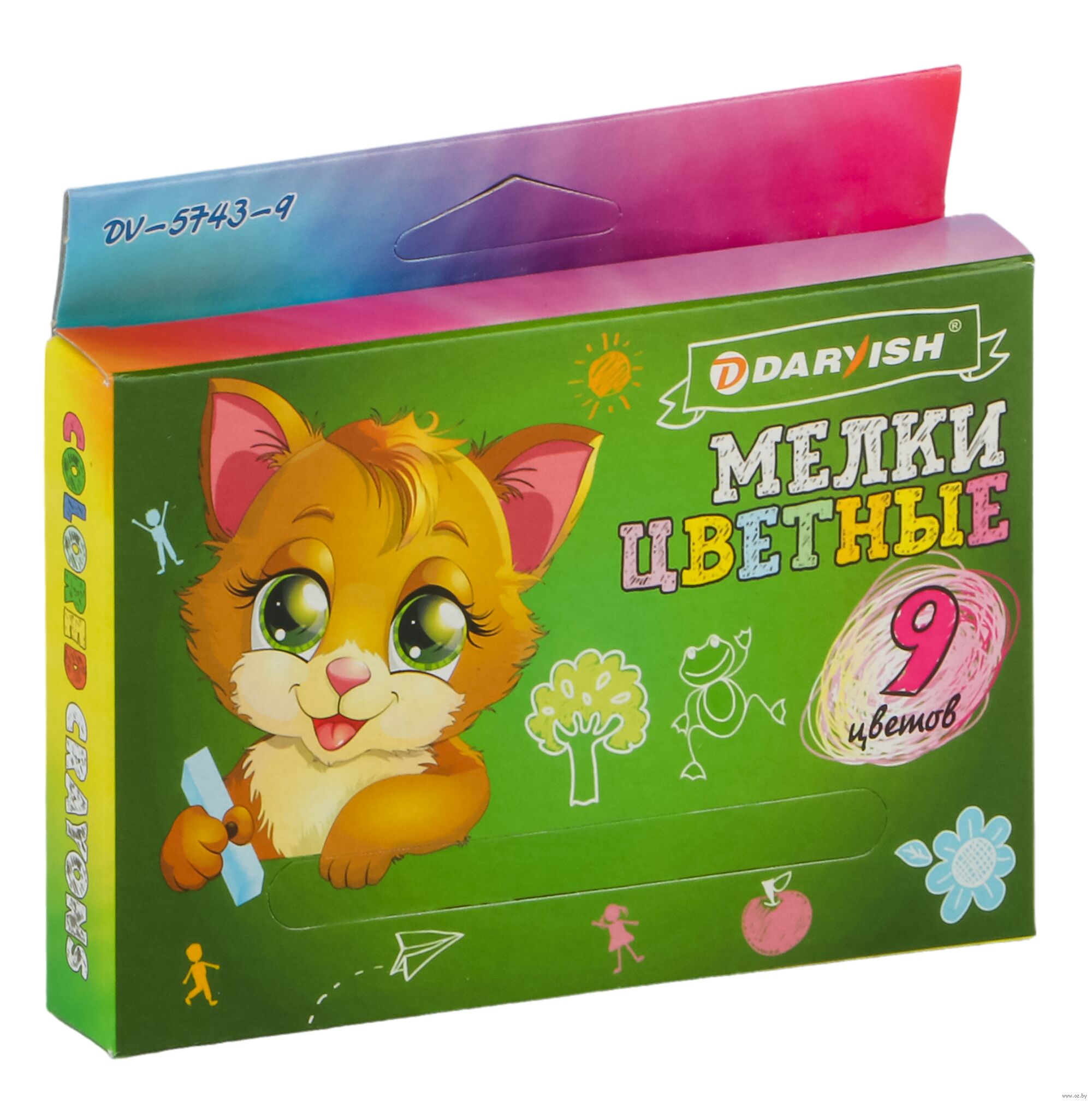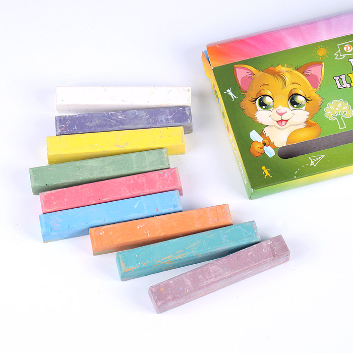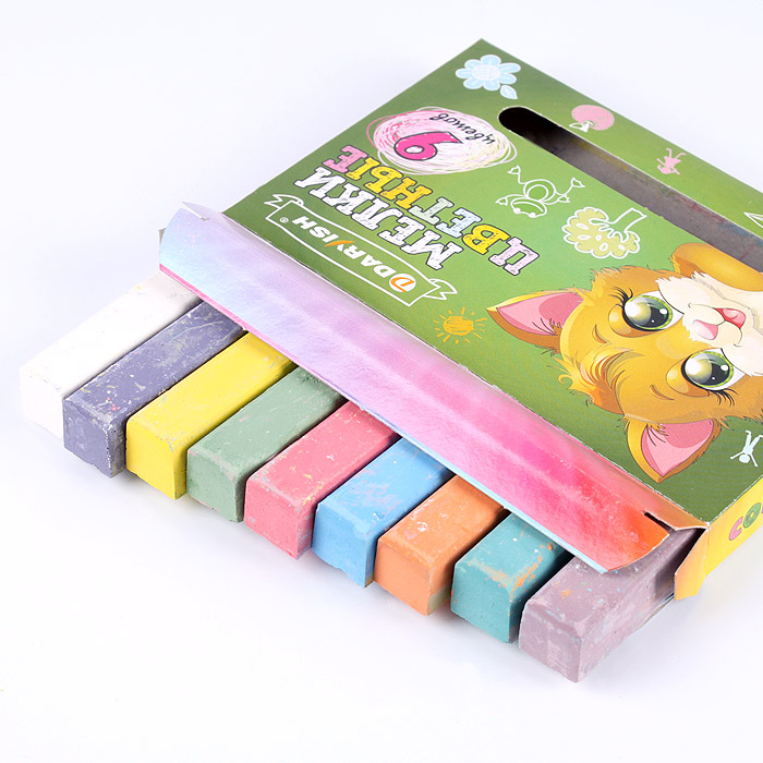 В наборе 9 цветных мелков (белый, красный, желтый, зеленый, синий, коричневый, оранжевый, голубой, фиолетовый).