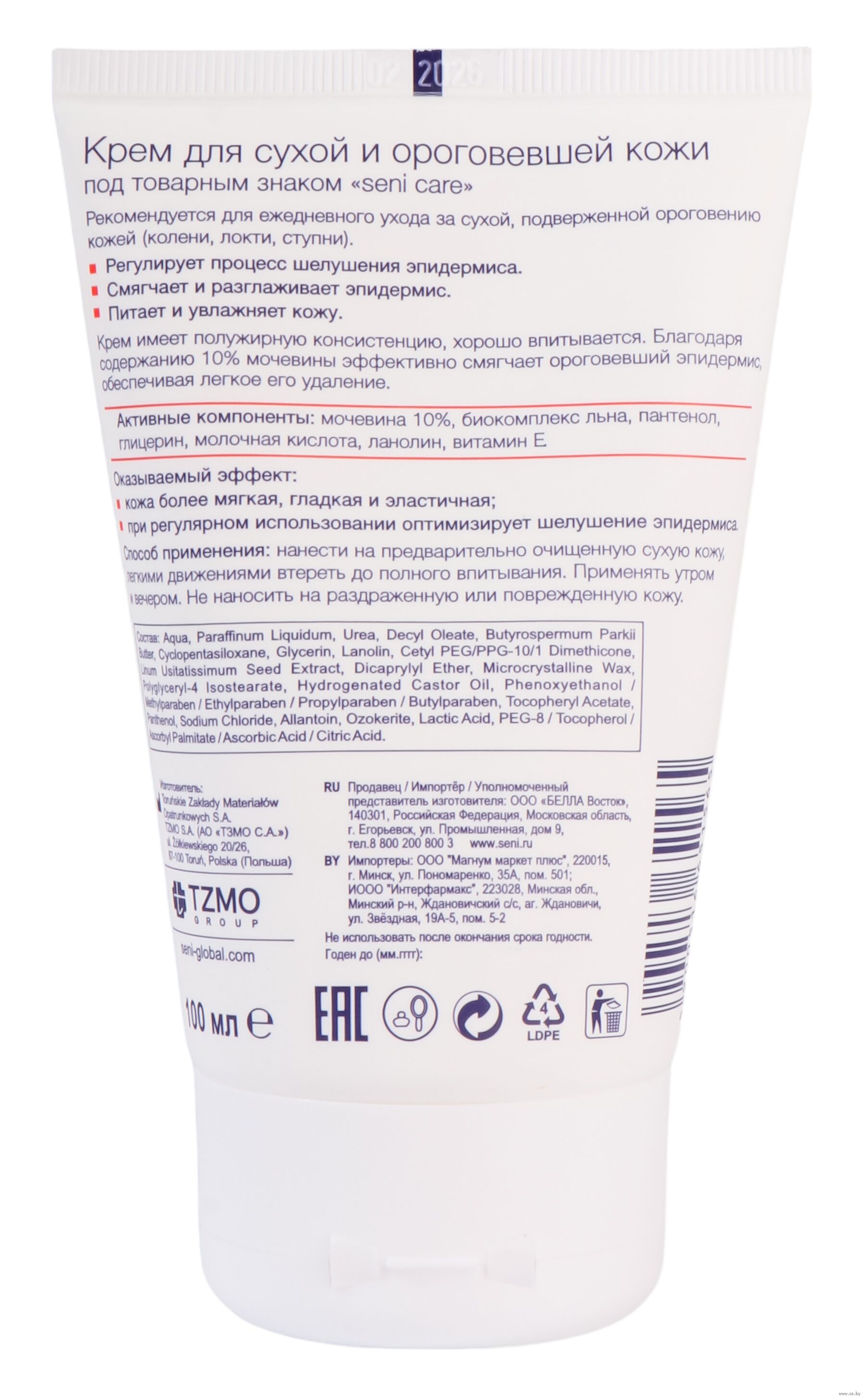 В местах, где кожа чрезмерно сухая и подвержена ороговению, необходимо интенсивное увлажнение и питание кожи. В таких случаях рекомендуется использовать средства с большей концентрацией мочевины, которая регулирует процесс шелушения и ороговения эпидермиса. Крем от "Seni. Care" с мочевиной (10%) отлично питает, увлажняет и смазывает ороговевшую кожу, например, колен, ног, локтей. Имеет богатую, полужирную консистенцию. Он легко распространяется и впитывается.