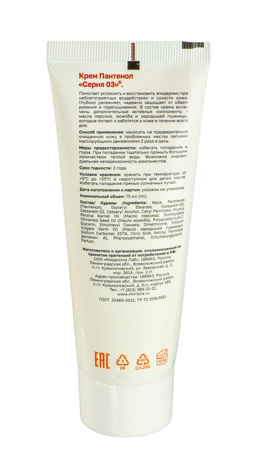 Aqua, panthenol (пантенол), glyceryl stearate, ceteareth-20, ceteareth-12, cetearyl alcohol, cetyl palmitate, prunus persica kernel oil (масло персика), simmondsia chinensis seed oil (масло жожоба), polyquaternium-7, glycerin, ethylhexyl cocoate, dimethicone, triticum vulgare germ oil (масло зародышей пшеницы), sodium carbomer, edta, citric acid, retinyl palmitate (витамин а), phenoxyethanol, ethylhexylglycerin, parfum.