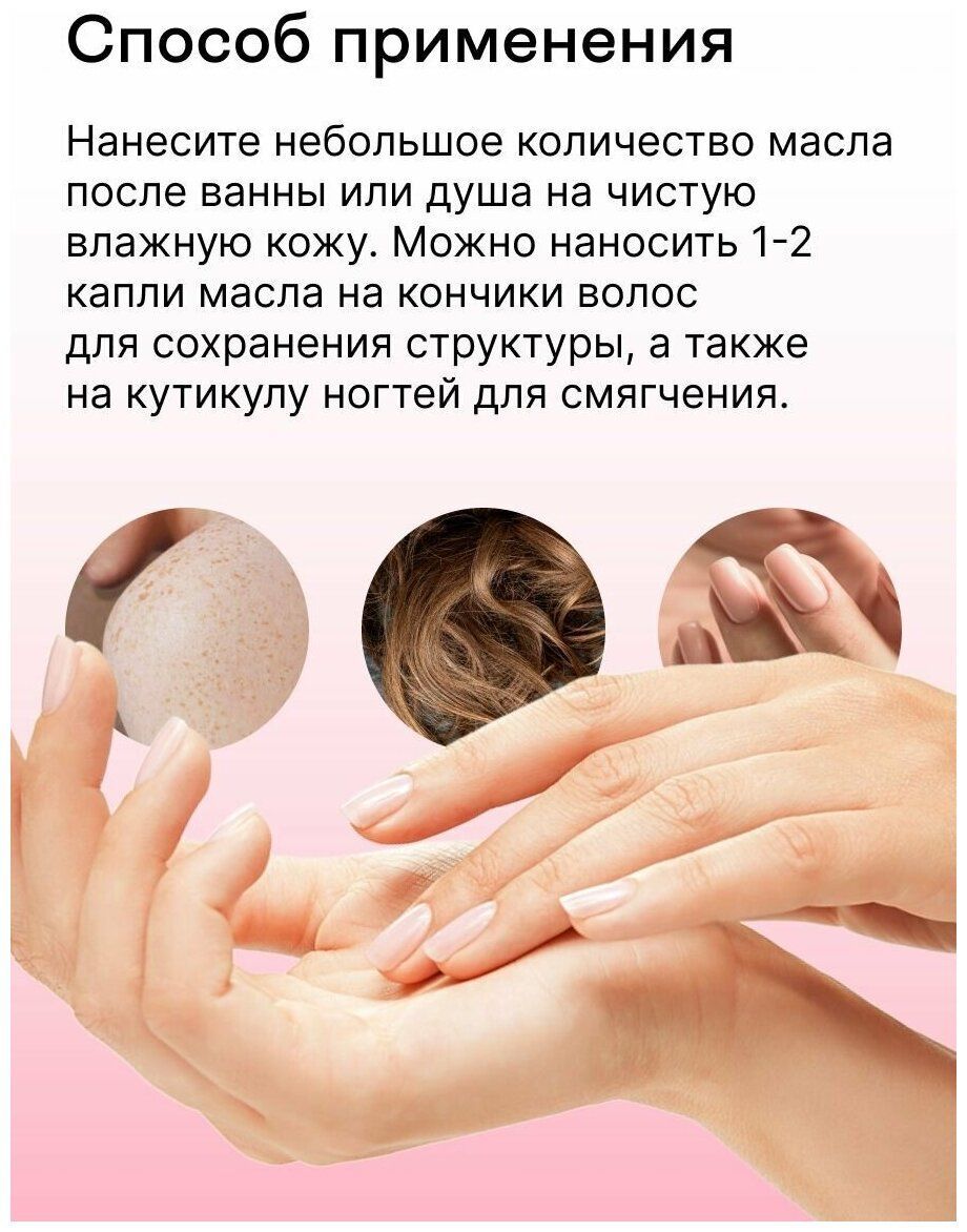 Нанесите небольшое количество масла после ванны или душа на чистую влажную кожу. Так оно легко распределится и быстро впитается, не оставляя липкости. Можно наносить 1-2 капли масла на кончики волос для сохранения структуры, а также на кутикулу ногтей для смягчения.Состав