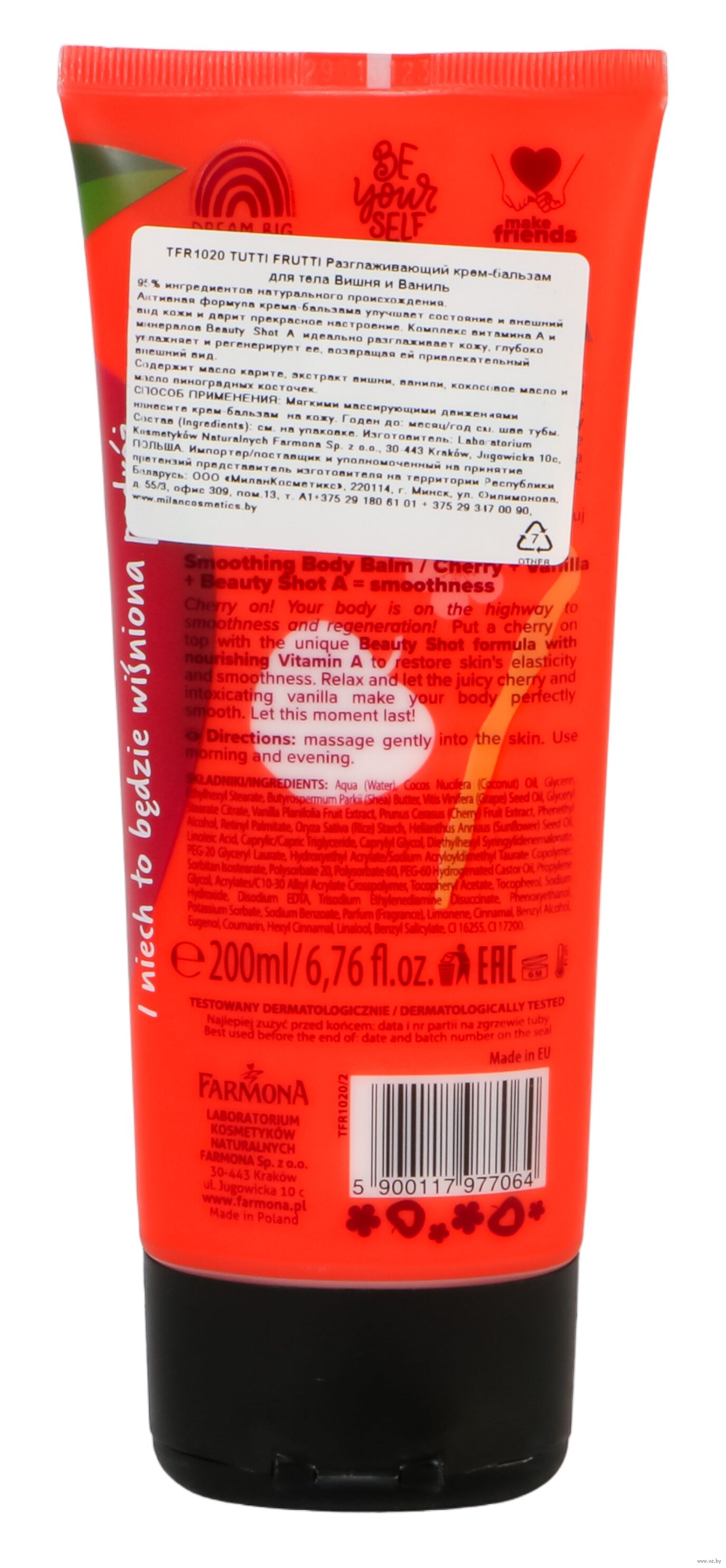 Крем-бальзам для тела способствует сглаживанию и регенерации кожи. Активная формула крема-бальзама улучшает состояние и внешний вид кожи и дарит прекрасное настроение. Комплекс витамина А и минералов Beauty Shot A идеально разглаживает кожу, глубоко увлажняет и регенерирует ее, возвращая ей привлекательный внешний вид. Содержит масло карите, экстракт вишни, ванили, кокосовое масло и масло виноградных косточек.