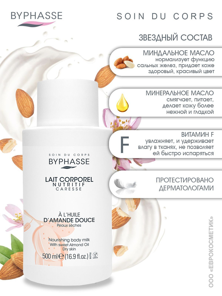 Миндальное масло содержит необходимые для кожи витамины А, Е и F, насыщает ее полезными веществами и влагой, запускает процесс регенерации клеток. Молочко замедляет процесс старения, повышает упругость и эластичность кожи. В результате кожа становится мягкой и увлажненной с тонким ароматом.