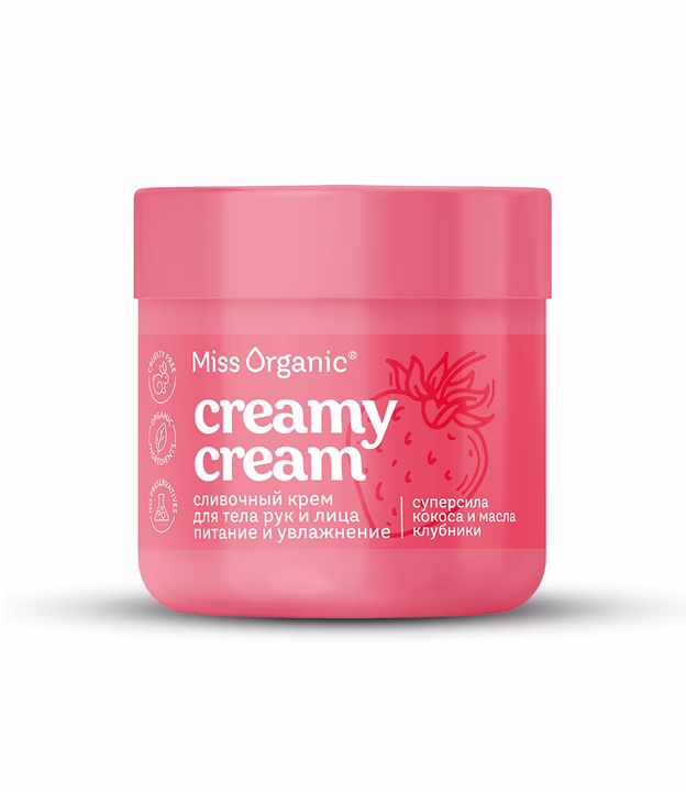 Сливочный крем для тела и рук – это спасение для кожи, которая так устала от абьюза сухости, шелушения и раздражения! В команде работают ингредиенты-герои с суперсилой: масло кокоса увлажнит и подарит гладкость, экстракт ароматной клубники сделает кожу еще более упругой и украдет твое сердечко.