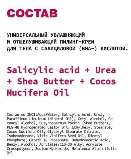 Использовать на участках сухой, огрубевшей кожи (локти, колени, ступни), также подходит для использования на себорейных, проблемных участках тела (спина, грудь). На очищенную кожу один раз в день. Курс 2 месяца.Состав