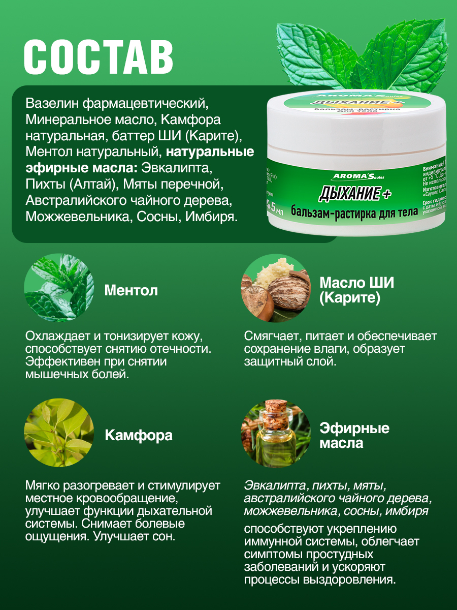 Вазелин фармацевтический, минеральное масло, камфора натуральная, баттер ШИ (Карите), ментол натуральный, натуральные эфирные масла: эвкалипта, пихты (Алтай), мяты перечной, австралийского чайного дерева, можжевельника, сосны, имбиря.