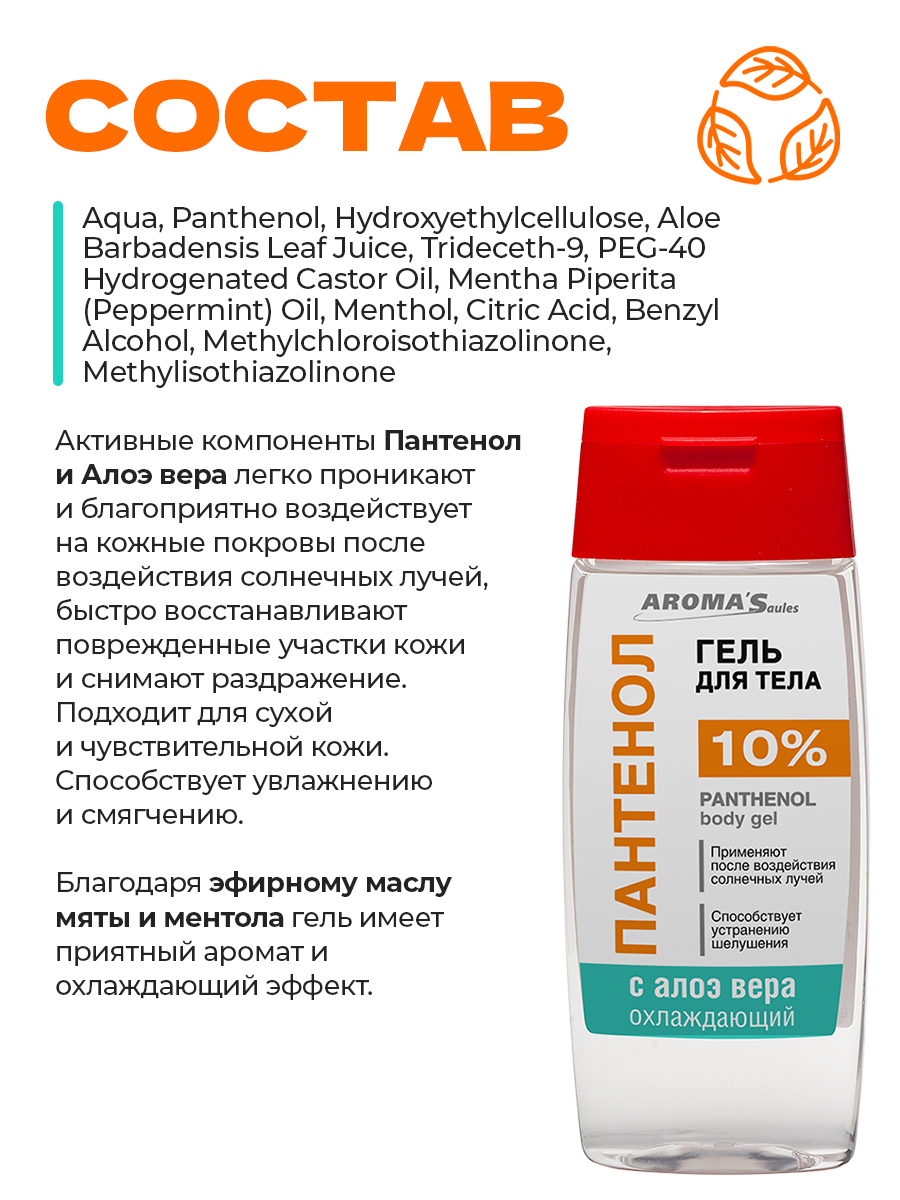 Гель "Пантенол 10% с Алоэ вера" оказывает комплексный уход за кожей. Активные компоненты Пантенол и Алоэ вера легко проникают и благоприятно воздействует на кожные покровы после воздействия солнечных лучей, быстро восстанавливают поврежденные участки кожи и снимают раздражение. Подходит для сухой и чувствительной кожи. Способствует увлажнению и смягчению.