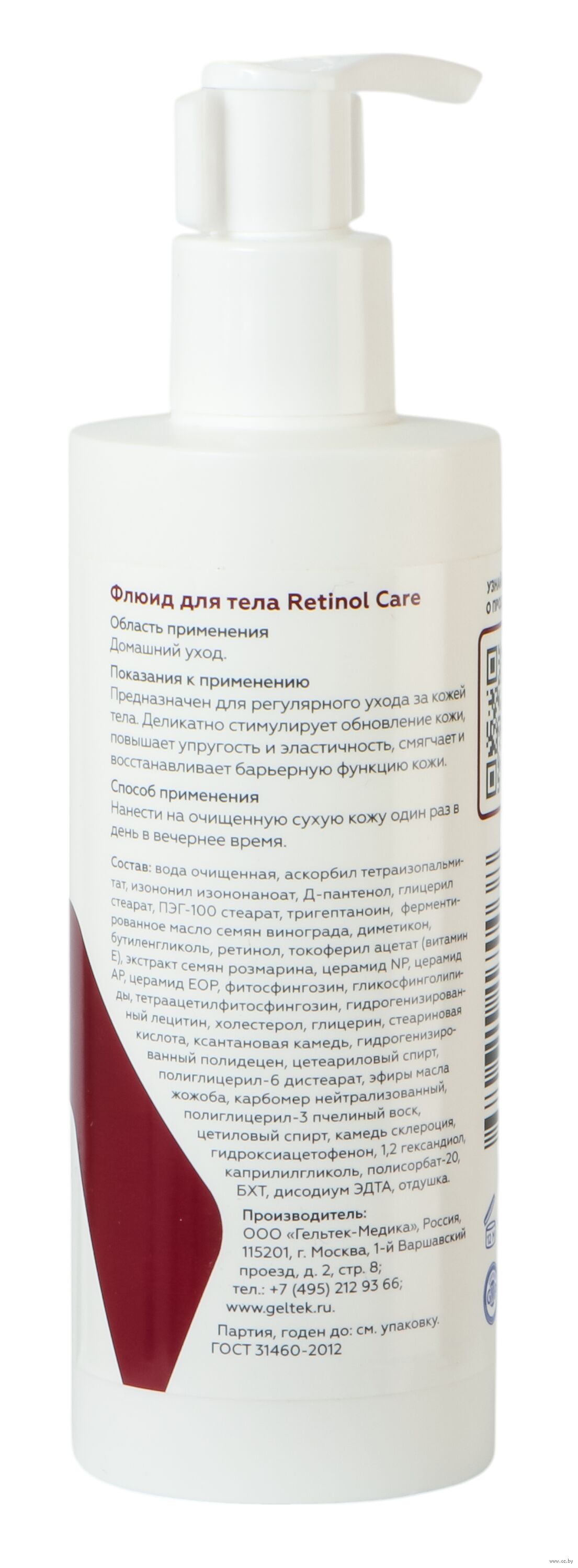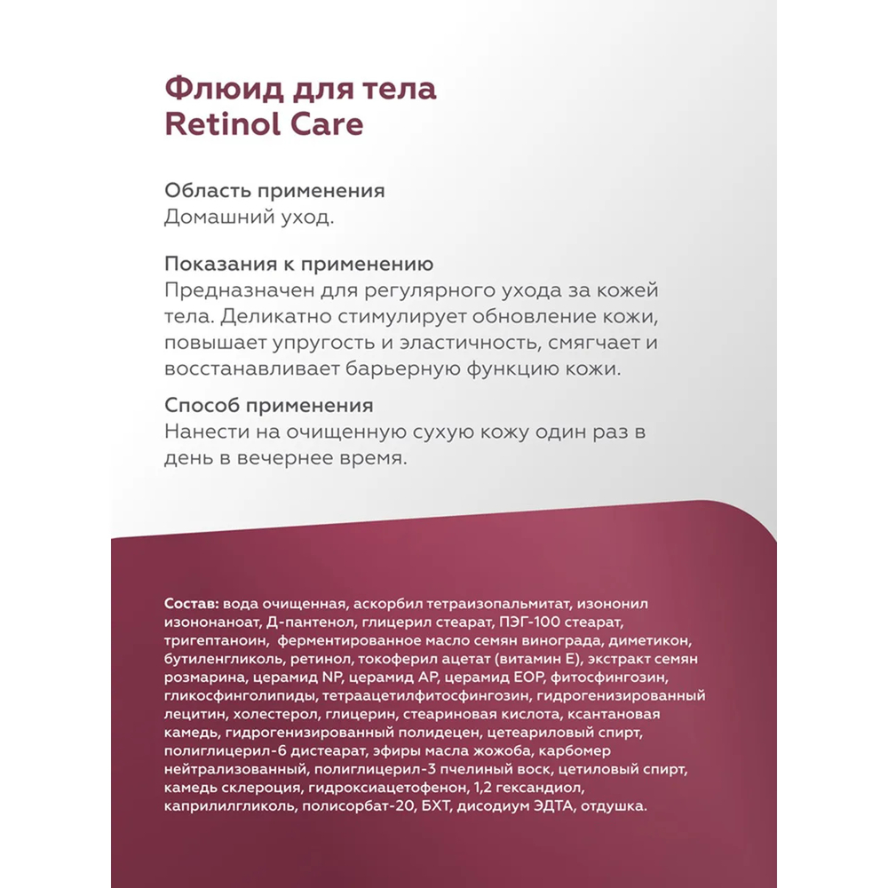 Предназначен для регулярного ухода за кожей тела. Основной компонент средства 0.1% ретинола. Деликатно стимулирует обновление кожи, повышает упругость и эластичность, смягчает и восстанавливает барьерную функцию кожи. Ускоряет процессы регенерации клеток, помогает уменьшить видимость тонких линий и выровнять микрорельеф кожи.