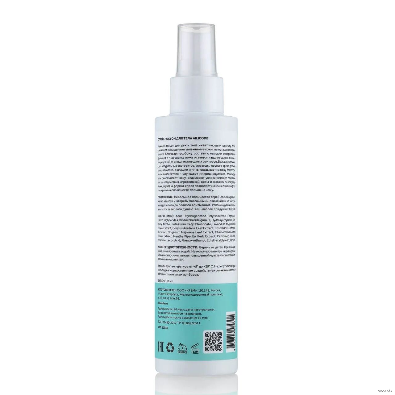 Небольшое количество спрей-лосьона равномерно нанести и втереть массажными движениями на чистую кожу рук и тела до полного впитывания.Состав