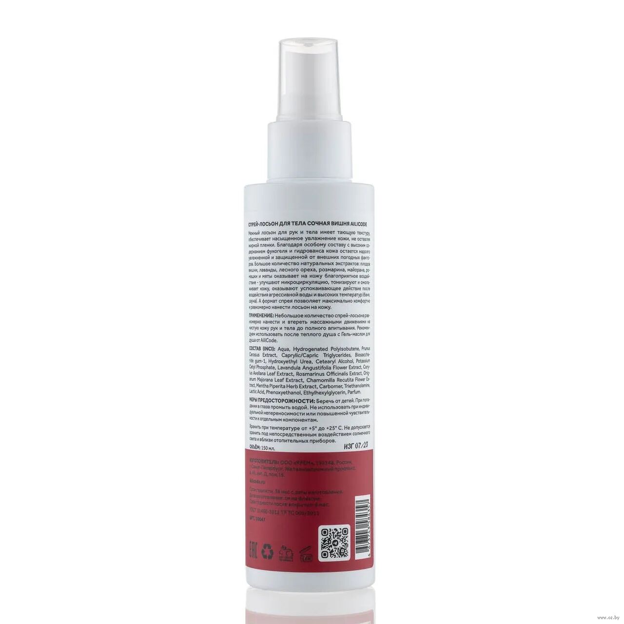 Небольшое количество спрей-лосьона равномерно нанести и втереть массажными движениями на чистую кожу рук и тела до полного впитывания.Состав