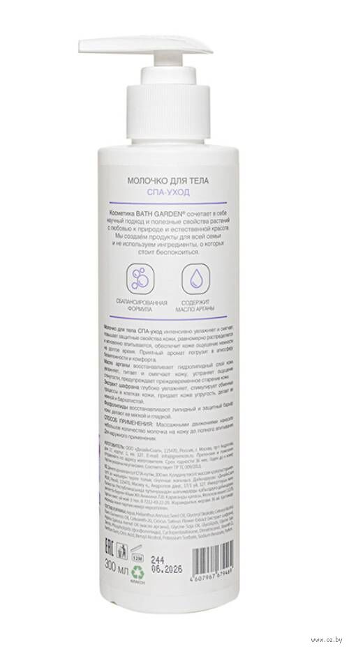 Молочко для тела СПА – уход интенсивно увлажняет и смягчает, повышает защитные свойства кожи, равномерно распределяется и мгновенно впитывается, обеспечит коже ощущение нежности на долгое время. Приятный аромат погрузит в атмосферу безмятежности и комфорта.