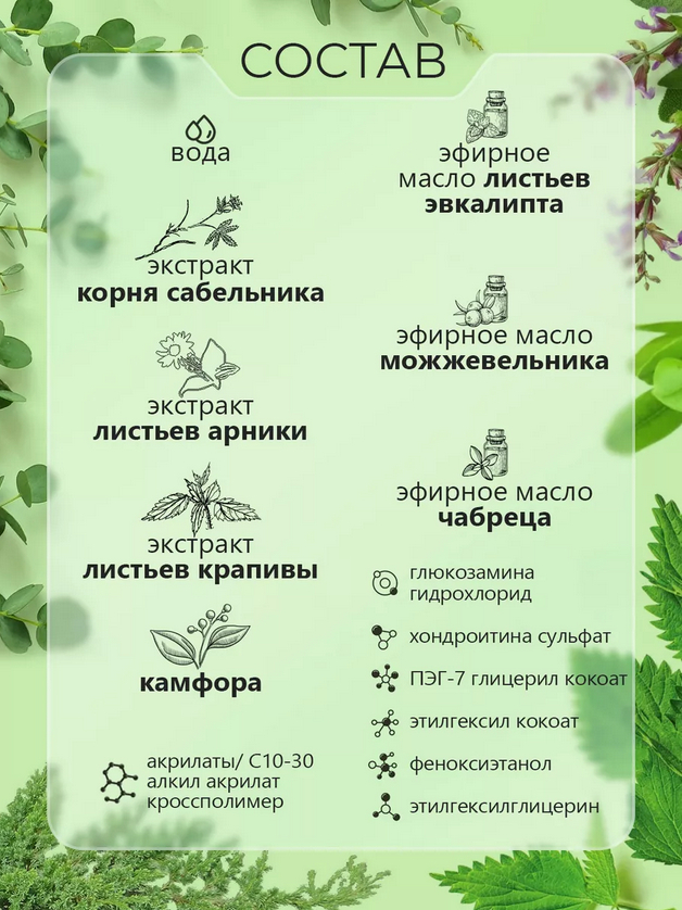 Aqua, Polysorbate 80, Rosmarinus Officinalis Flower Oil, Glucosamine HCl, Sodium Chondroitin Sulfate, Juniperus Communis Fruit Oil, Hydrolyzed Comarum Palustre Root Extract, Sodium Carbomer, EDTA, Phenoxyethanol, Ethylhexylglycerin.