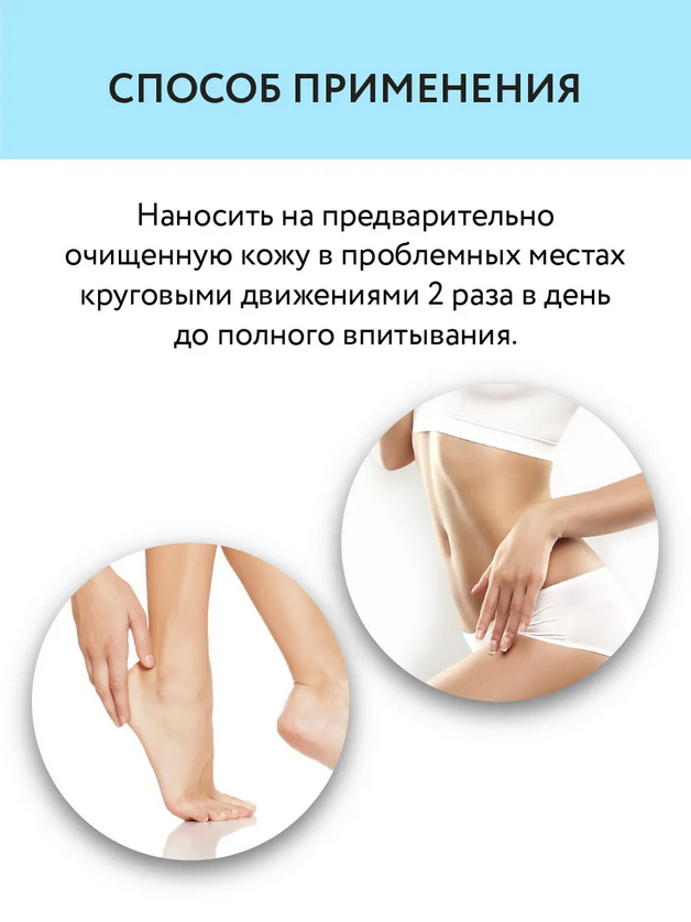 Наносить на предварительно очищенную кожу в проблемных местах круговыми движениями 2 раза в день до полного впитывания.Состав