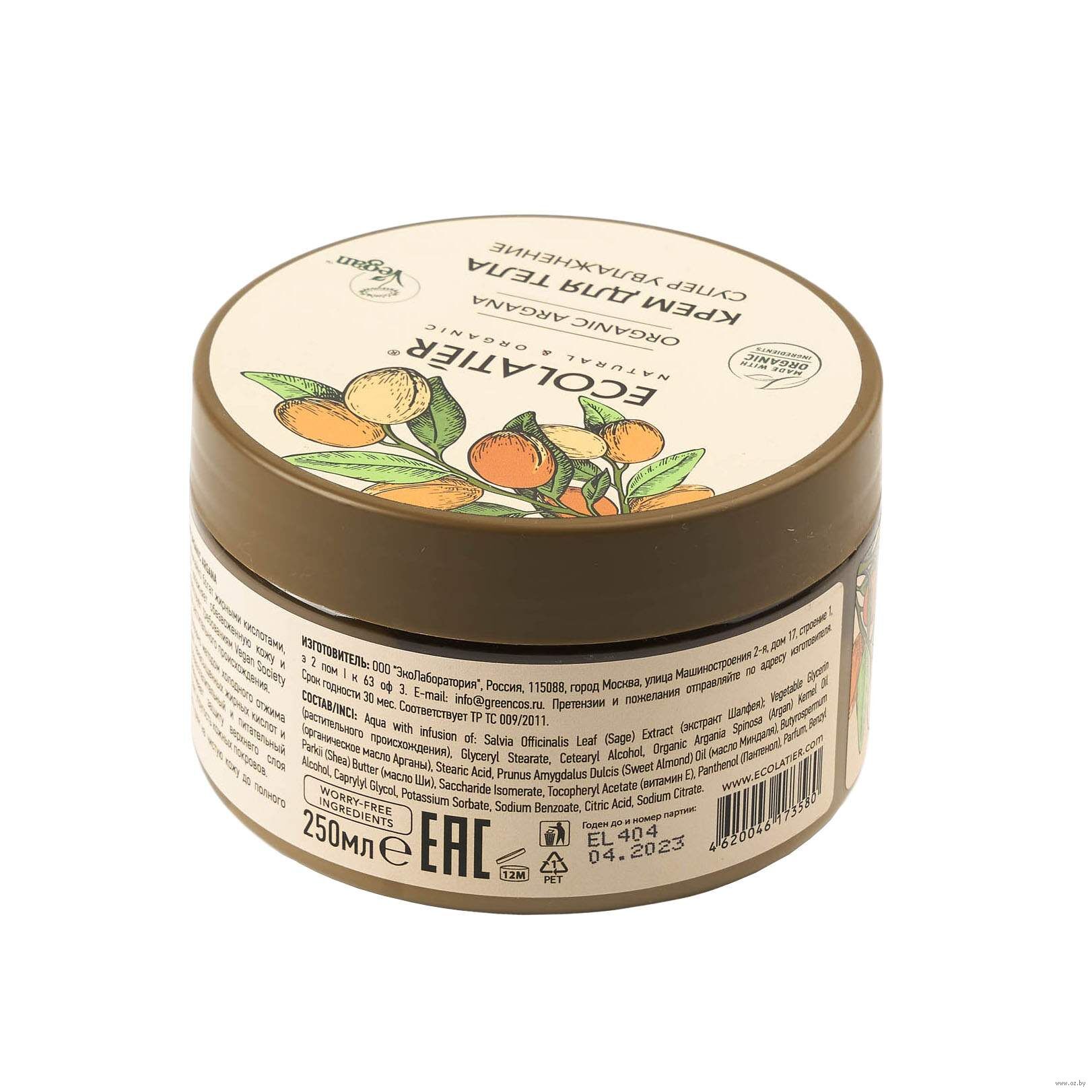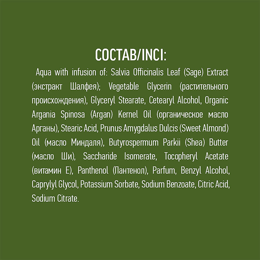 Aqua, Salvia Officinalis Leaf (Sage) Extract (экстракт шалфея), Vegetable Glycerin (растительного происхождения), Glyceryl Stearate, Cetearyl Alcohol, Organic Argania Spinosa (Argan) Kernel Oil (органическое масло арганы), Stearic Acid, Prunus Amygdalus Dulcis (Sweet Almond) Oil (масло миндаля), Butyrospermum Parkii (Shea) Butter (масло ши), Saccharide Isomerate, Tocopheryl Acetate (витамин Е), Panthenol (пантенол), Parfum, Benzyl Alcohol, Caprylyl Glycol, Potassium Sorbate, Sodium Benzoate, Citric Acid, Sodium Citrate