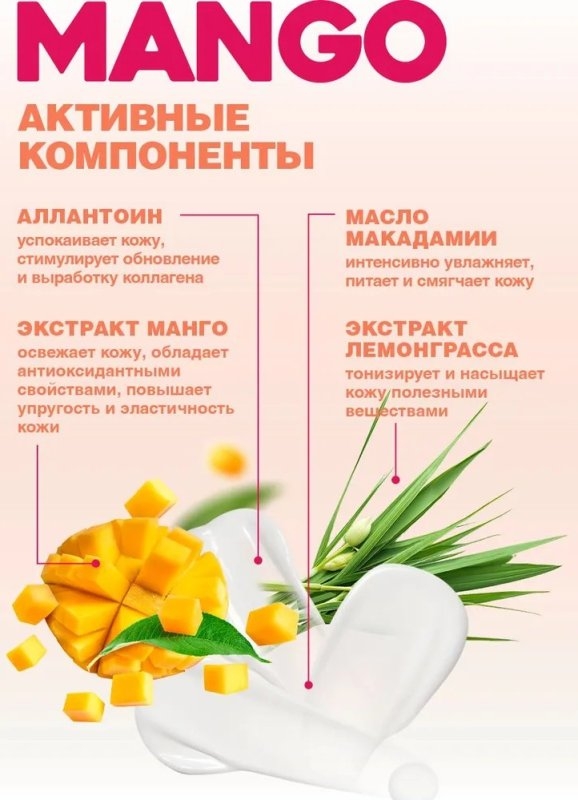 Лосьон обладает нежной текстурой и бодрящим ароматом сочного манго, дарит коже полноценный уход, интенсивно питает, увлажняет и смягчает. Зарядись энергией!