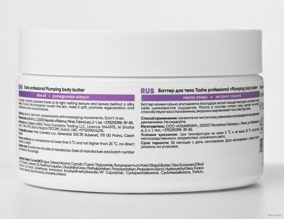 Баттер, с ароматом цветущей вишни, сочного граната и амбры, имеет тающую текстуру, которая легко распределяется по коже, моментально впитывается, не оставляя следов на одежде и неприятных ощущений на коже. Масла в составе, питают кожу, возвращая ей мягкость и упругость, тонизируют и улучшают внешний вид, защищают от обезвоживания и негативного воздействия внешних факторов.