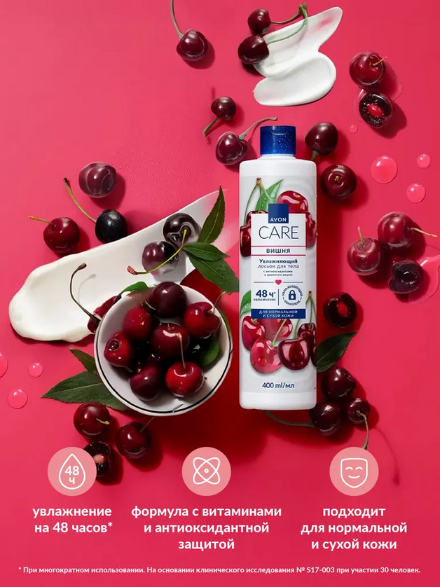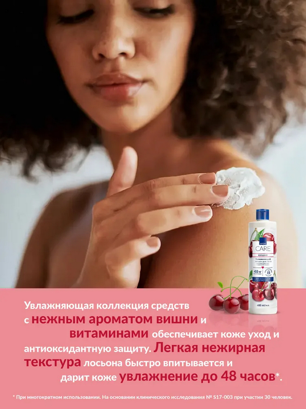 Увлажняющая коллекция средств с нежным ароматом вишни и витаминами обеспечивает коже уход и антиоксидантную защиту.