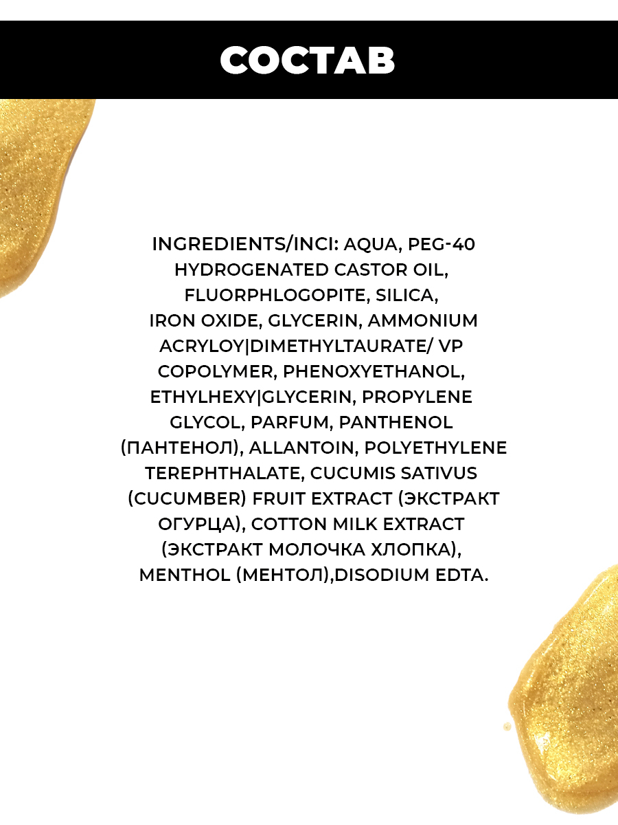 Aqua, PEG-40 Hydrogenated Castor Oil, Fluorphlogopite, Silica, Iron Oxide, Glycerin, Ammonium Acryloyldimethyltaurate/ VP Copolymer, Phenoxyethanol, Ethylhexylglycerin, Propylene Glycol, Parfum, Panthenol (Пантенол), Allantoin, Polyethylene Terephthalate, Cucumis Sativus (Cucumber) Fruit Extract (Экстракт огурца), Cotton Milk Extract (Экстракт молочка хлопка), Menthol (Ментол), Disodium EDTA.Мы используем файлы cookie для обеспечения удобства работы с сайтом и его контакта с пользователем.