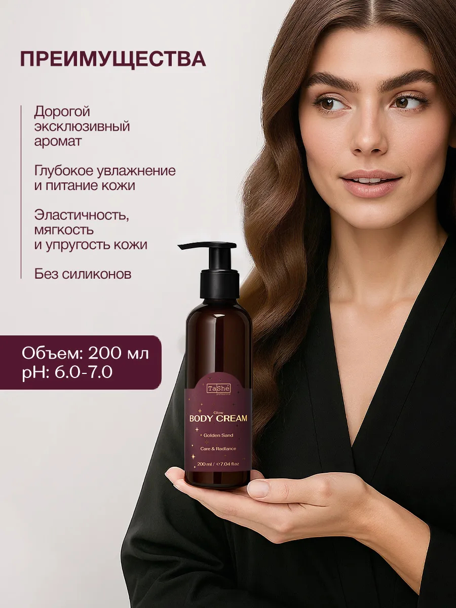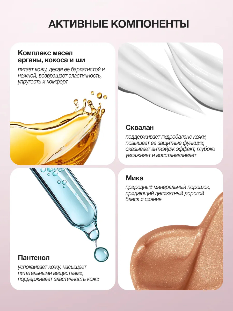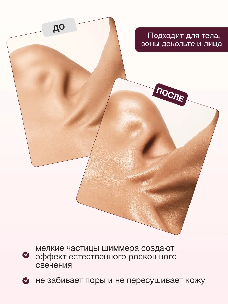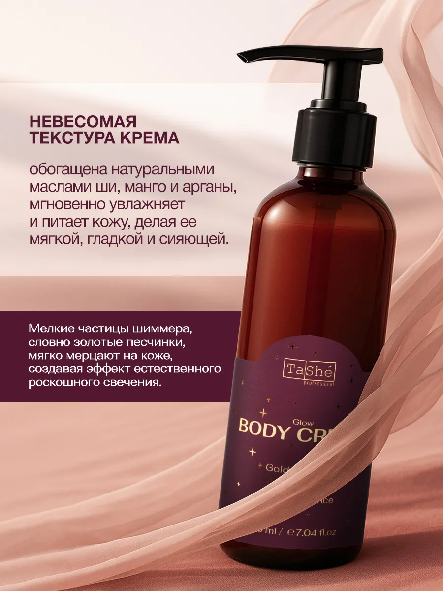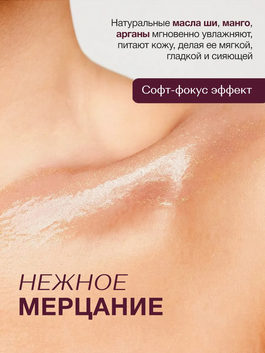Невесомая текстура крема, обогащенная натуральными маслами ши, манго и арганы, мгновенно увлажняет и питает кожу, делая ее мягкой, гладкой и сияющей. Мелкие частицы шиммера, словно золотые песчинки, мягко мерцают на коже, создавая эффект естественного роскошного свечения.