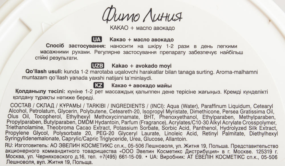 Aqua (Water), Paraffinum Liquidum, Cetearyl Alcohol, Petrolatum, Glycerin, Polybuten, Ceteareth-20, Isopropyl Myristate, Dimethicone, Persea Gratissima Oil, Olus Oil, Tocopherol, Ethylhexyl Methoxycinnamate, BHT, Phenoxyethanol, Ethylparaben, Methylparaben, Propylparaben, Butylparaben, DMDM Hydantoin, Parfum (Fragrance), Acrylates/C10-30 Alkyl Acrylate Crosspolymer, Triethanolamine, Theobroma Cacao Extract, Potassium Sorbate, Sorbic Acid, Panthenol, Hydrolyzed Silk Extract, Propylene Glycol, Polysorbate 20, PEG-20 Glyceryl Laurate, Linoleic Acid, Retinyl Palmitate, Diethylhexyl Syringylidenemalonate, Caprylic/Capric Triglyceride, Urea, Glucose, Allantoin.Мы используем файлы cookie для обеспечения удобства работы с сайтом и его контакта с пользователем.