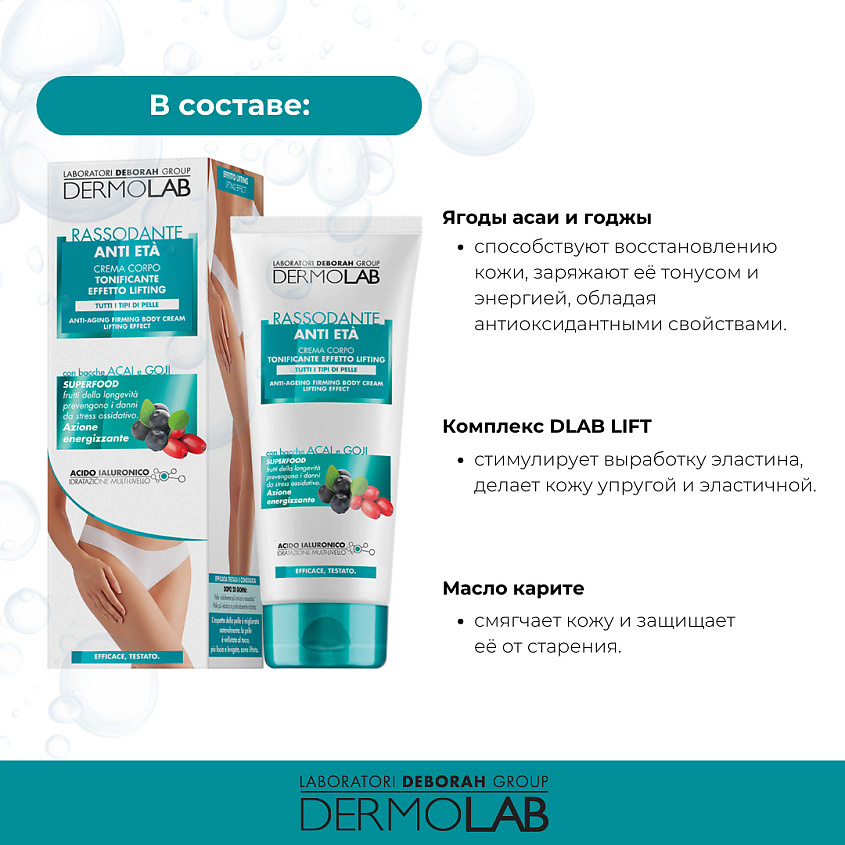 Комплекс Dlab Lift на основе экстракта акмеллы стимулирует выработку эластина, делает кожу упругой и эластичной. Масло карите смягчает кожу и защищает её от старения.
