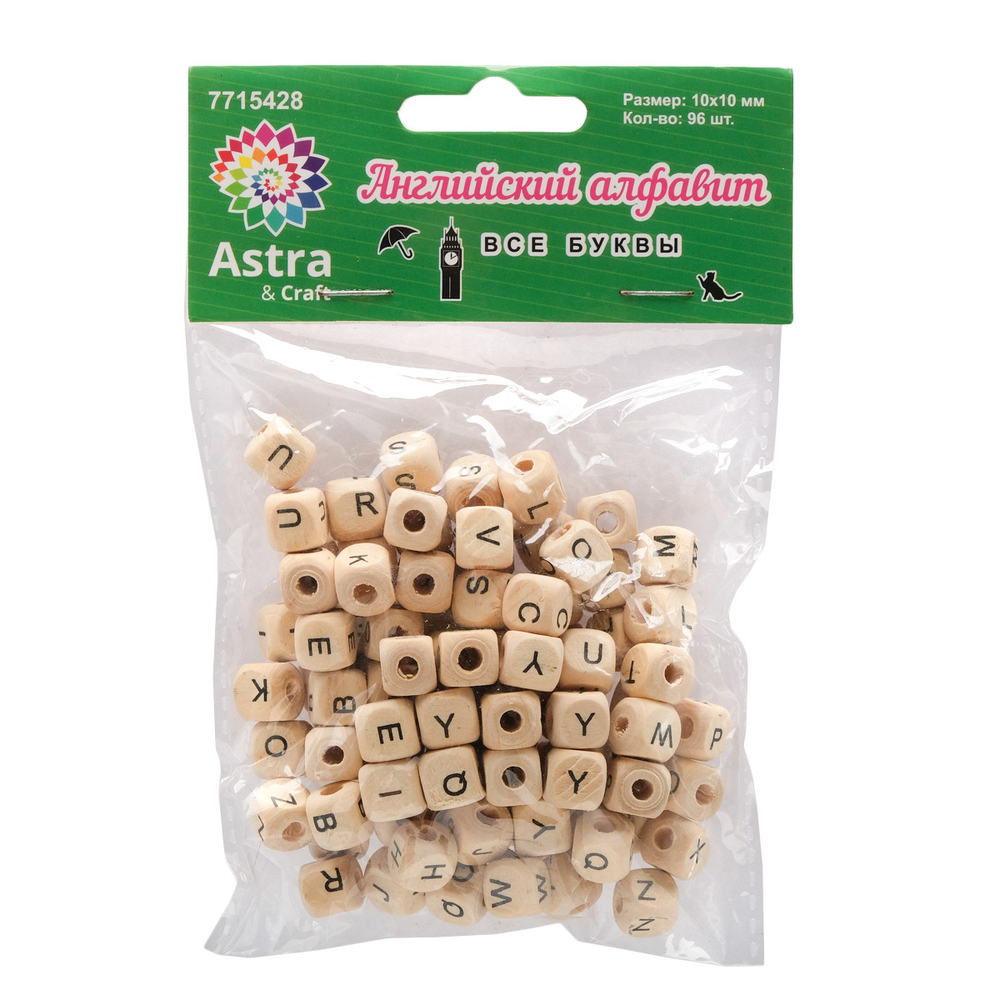 Деревянные бусины в форме кубиков с английскими буквами – основа для различных поделок. Из деревянных бусин можно создавать бижутерию, украшения на рождественскую елку, развивающие игрушки для детей и многое другое.