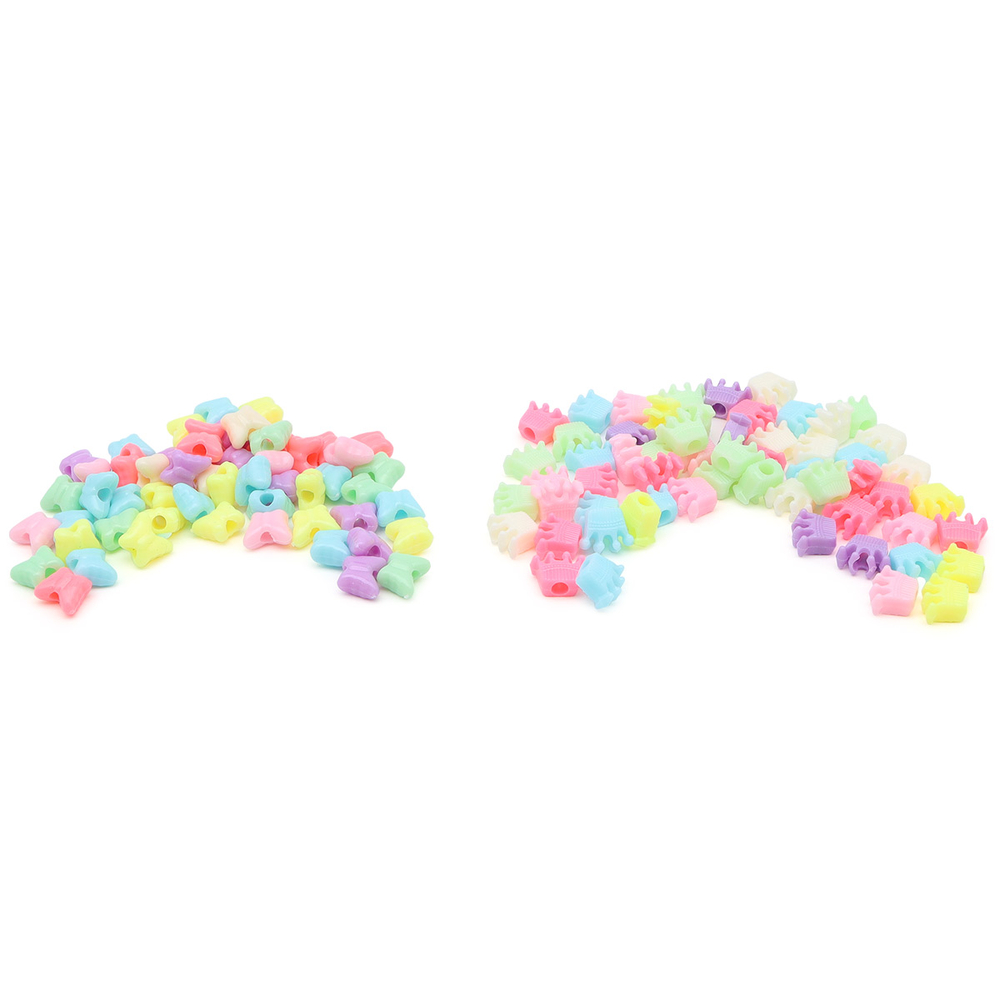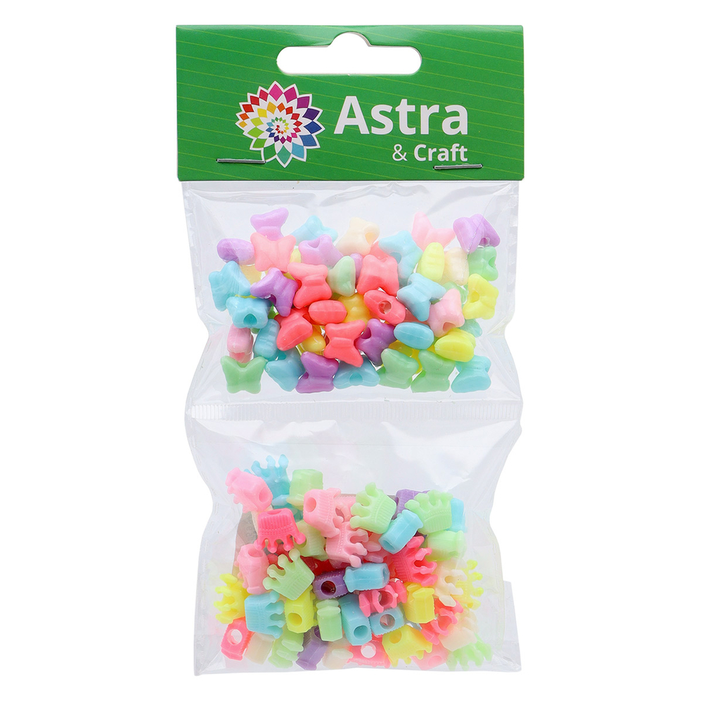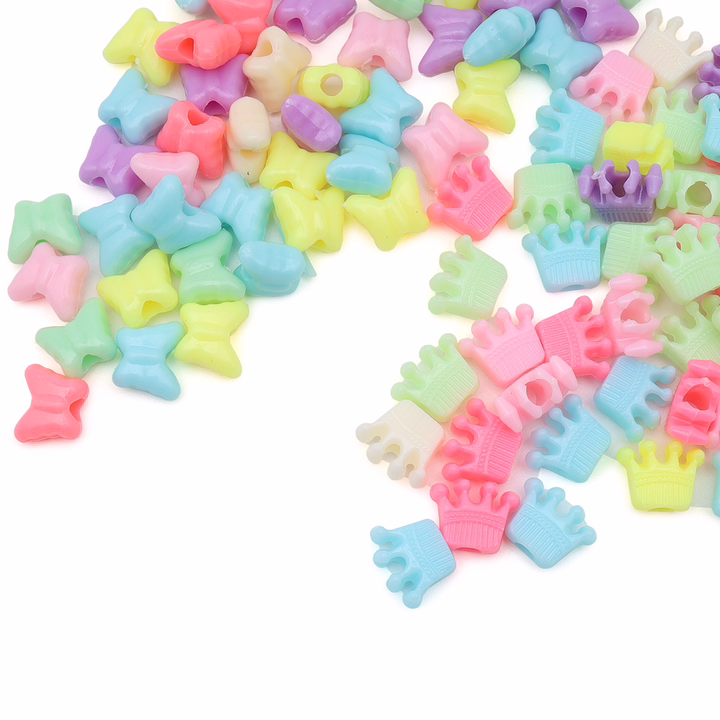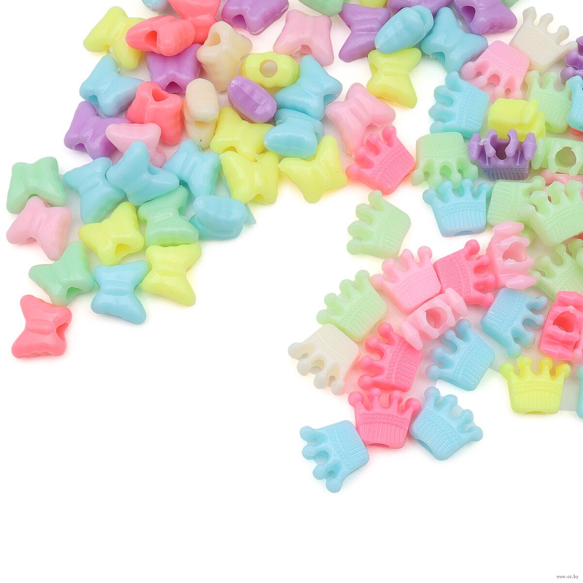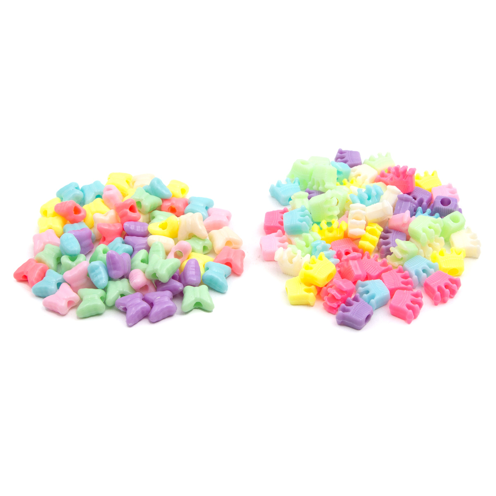 Для создания поделок предлагаются бусины для рукоделия крупные: бабочка 11х9,5х5,5 мм, диаметр отверстия 3,5 мм; корона 12х10х5 мм, диаметр отверстия 4 мм. Благодаря крупному размеру, с этими бусинами могут заниматься дети от трех лет. Для нанизывания используйте леску или нить-резинку. Пластиковые бусины отличаются стойкостью к воздействию влаги и потере цвета.