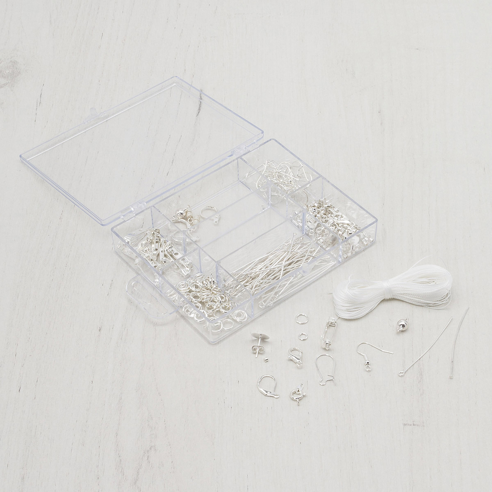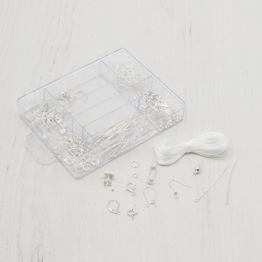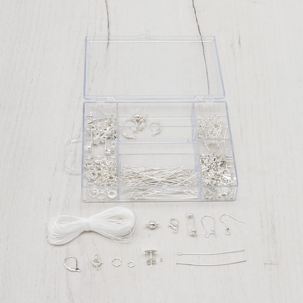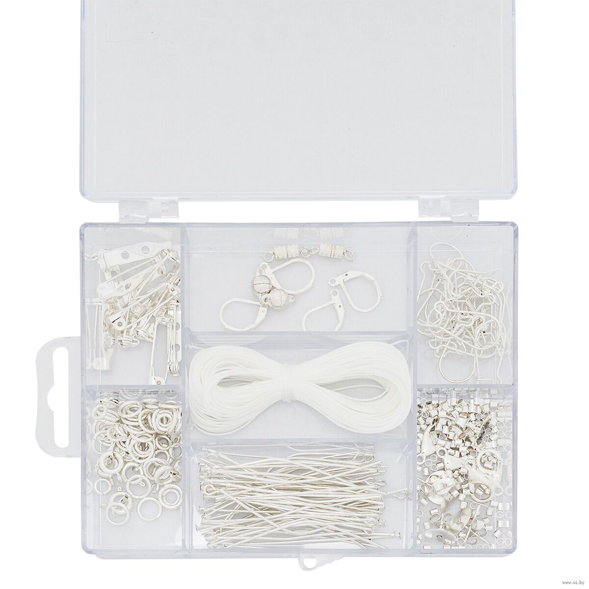 В наборе: футляр из прозрачного пластика с отсеками и крышкой, швензы-петли с французской застежкой для сережек 20,4 мм, швензы-крючок для сережек 19,4 мм, основа для броши и значка 20,5x4,6 мм, пины (штифты) со шляпкой 51,5 мм, замок-винтовой 12,9 мм, замок-карабин 14,6 мм, швензы-гвоздики (пусеты) 11,8x10 мм, швензы – левербек 13,1 мм, пины (штифты) с петелькой 50,2 мм, застежка магнитная 10,1 мм, соединительные кольца d 5,4 мм, замок карабин (шпрингель) 13,6x10,2 мм, кримпы 2,5 мм, соединительные кольца d 7,6 мм, нейлоновая нить 18,5 м.